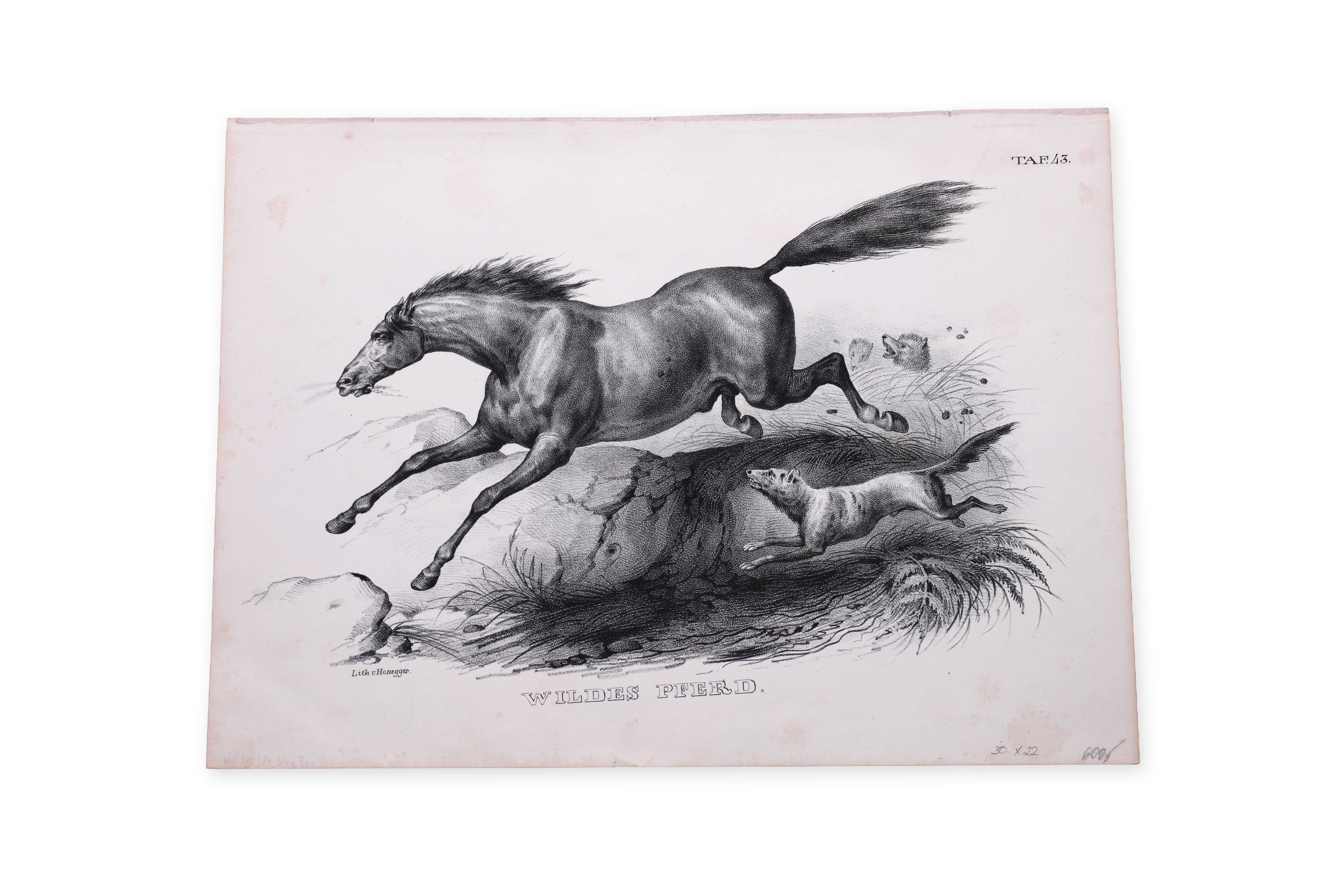 Lithographic print with German label "Wildes Pferd", depicting a dramatic scene of a wild horse running from a weasel-like beast. The horse is shown in a sharp leap over a rocky crag, while other predators appear in the background. Signature "Lith. V. Honegger" in lower left corner.Bidders are obliged to inform themselves about the condition of the lots before the auction, subsequent complaints will not be taken into account.