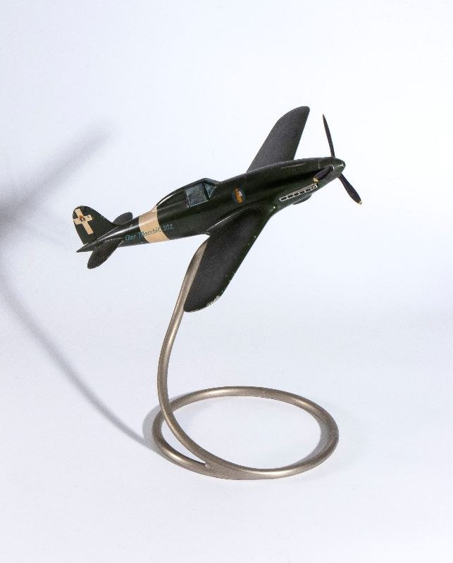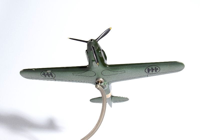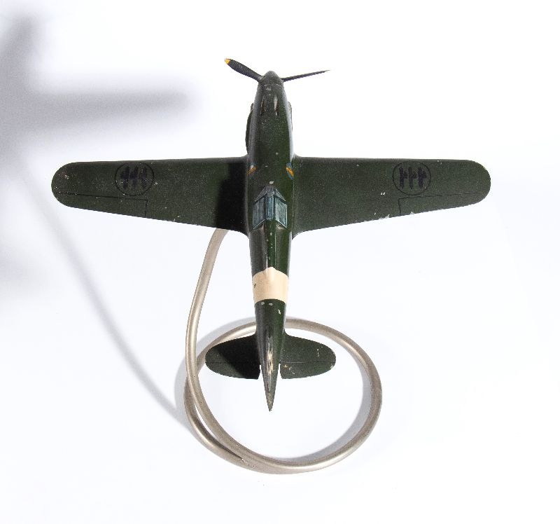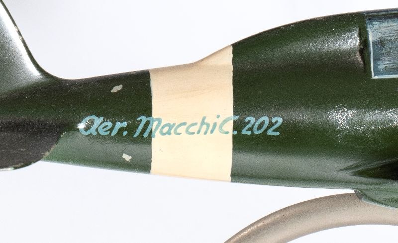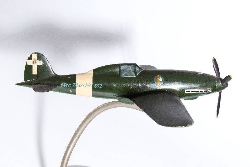 Autarchic cast aluminum model of the G202 fighter of AER MACCHI. Three-bladed rotating propeller, original livery of the Kingdom of Italy with fascist emblems on the fuselage. Spiral metal pedestal, original, with joint on the belly of the plane to adjust its positioning. Original paint, with signs of aging. In good original condition, propaganda product of the Aer Macchi company from the 1930s, measures approximately 35 cm of wingspan, 33 cm of length
