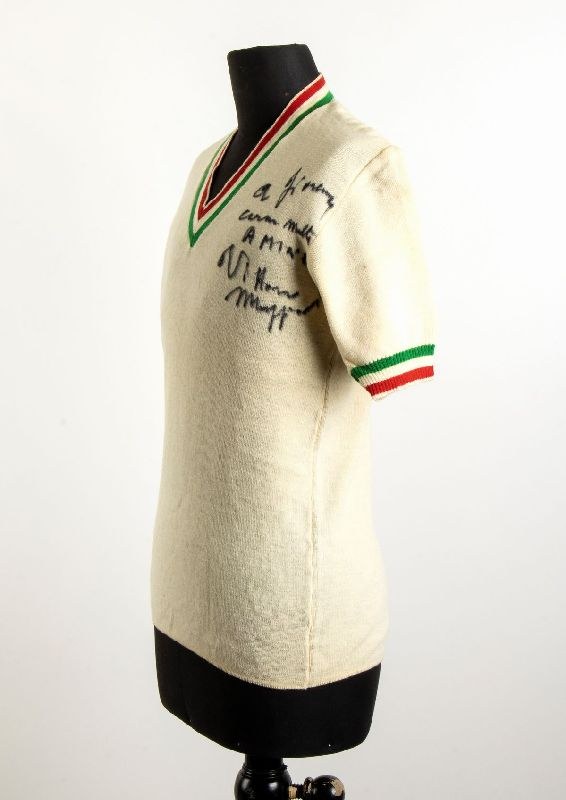 White shirt of Vittorio Maggioni, Italian cross-country champion in the 1500m in 1951. Short-sleeved shirt, in wool, with "V" neckline, white, red and green outlines for the Italian champion title on the neck and sleeves. Dedication with autograph in black marker, handwritten by Maggioni, on the left chest. Together with the shirt we have the medal for participation in the 1951 Italian Men's Championships - Milan 28-29-30 September. Gilded silver medal (stamp 800) preserved in the original S.A.Picchiani & Barlacchi Firenze box. Lot in excellent condition