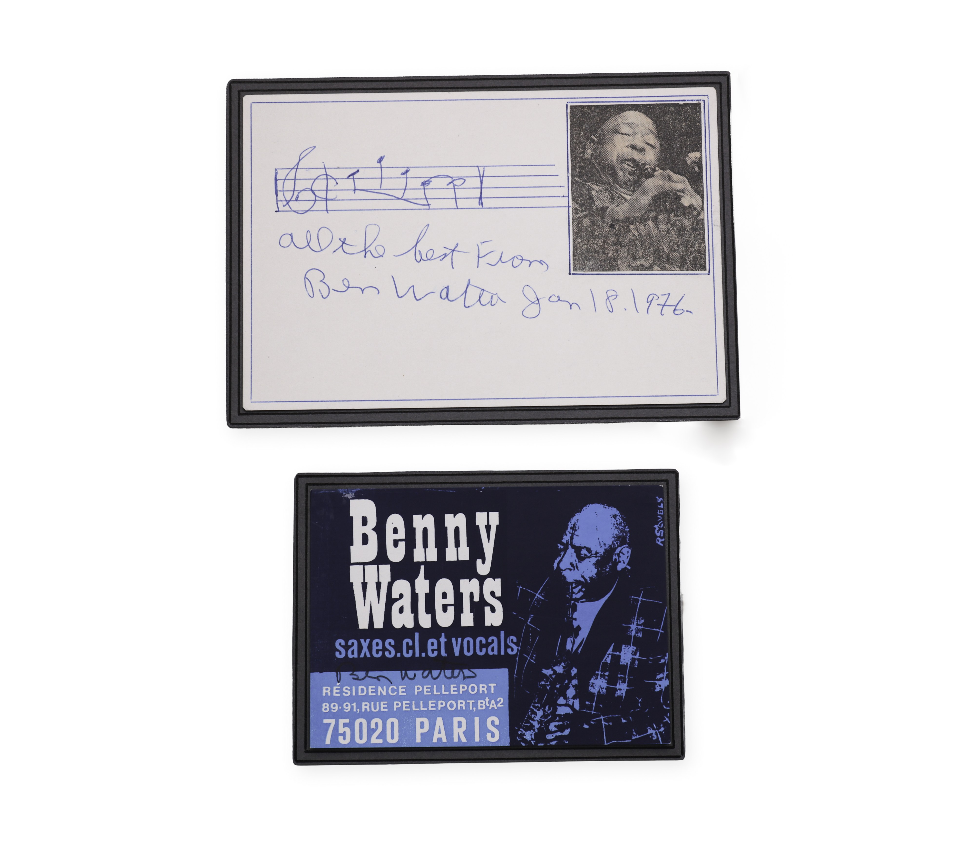 Benjamin (Benny) Waters signature on autograph card with sheet music, photograph, dedication and date 18 January 1976, accompanied by another signature in full name on card "Benny Waters saxes cl et vocals". Benny Waters was an American jazz saxophonist, clarinetist and singer, renowned for his energy, virtuosity and long career spanning from the 1920s to the 1990s.Bidders are obliged to inform themselves about the condition of the lots before the auction, subsequent complaints will not be taken into account.