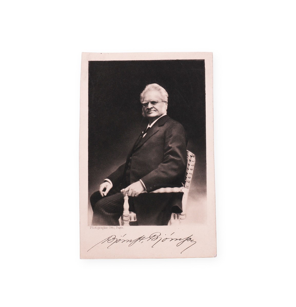 Photograph showing the Norwegian writer and Nobel Prize winner for literature Bjørnstjerne Bjørnson in a dignified, autographed seated portrait. The picture was taken in the Otto studio in Paris. Bjørnson (1832 – 1910) was one of the most important figures in Norwegian literature of the 19th century. He became famous as a playwright, poet and author of the Norwegian anthem. His work is characterized by deep patriotism, humanism and involvement in issues of national identity.Bidders are obliged to inform themselves about the condition of the lots before the auction, subsequent complaints will not be taken into account.