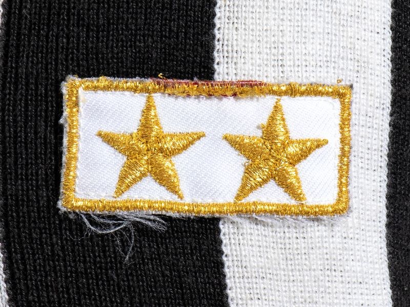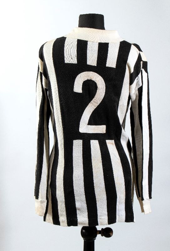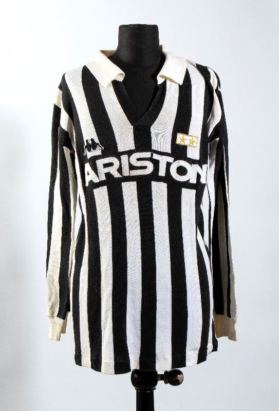 Long-sleeved cotton home jersey (label missing). Black and white jersey with white cuffs and a white collar on a black V-neck, in excellent condition, with minor signs of wear.On the front: ARISTON sponsor embroidered in white (large characters, approximately 46-50 mm high), KAPPA logo, gold braid patch with two stars sewn onto the chest.On the back: sewn-in cotton number 2.The jersey is presumably from the 1985-86 and 1987-89 seasons and can be attributed to one of the players (Luciano Favero, Nicola Caricola, and Pasquale Bruno) who wore the number 2 in those seasons, having been unable to obtain precise information from the family due to the apparent lack of a "conferente."Provenance: Sports journalist, private collection