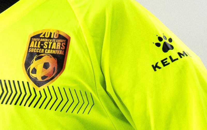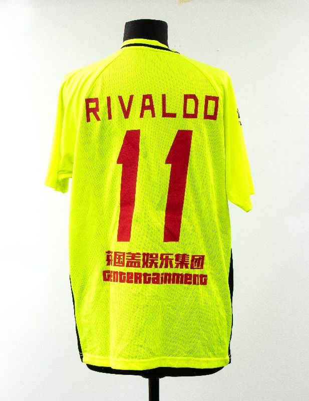 Match jersey for the "South America vs. Europe ALL STARS SOCCER CARNIVAL" soccer match played in 2016 in Chongqing, China, between two teams featuring former European and South American stars. Yellow, short-sleeved jersey.On the front: technical sponsor KELME, sublimation emblem of the soccer event, event sponsor with ideogram text and the G-ENTERTAINMENT title in sublimation.On the back: RIVALDO name in sublimation, number 11 in sublimation, ideogram text and the G-ENTERTAINMENT title in sublimation.On the sleeves: KELME sponsor on both sleeves.Jersey worn by Rivaldo (Rivaldo Vítor Borba Ferreira - Paulista, April 19, 1972) in the match in question. In excellent condition.Provenance: Former soccer player (not Italian).