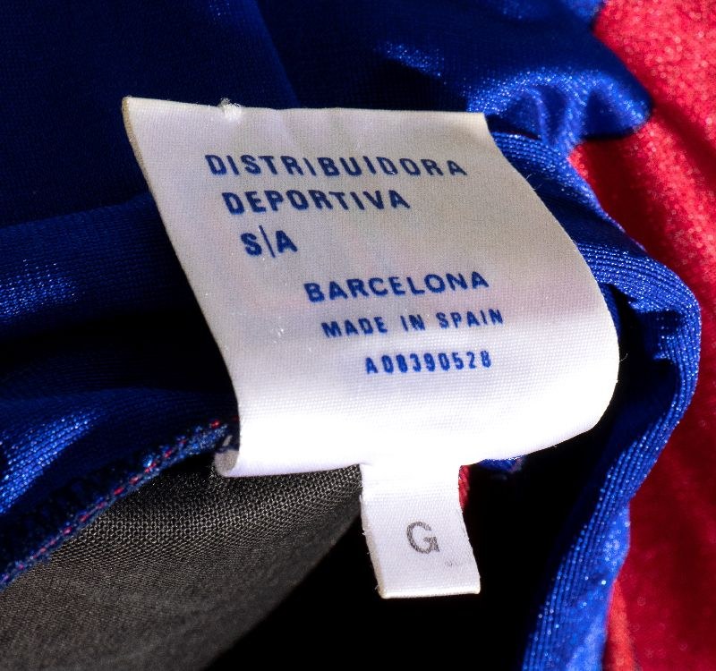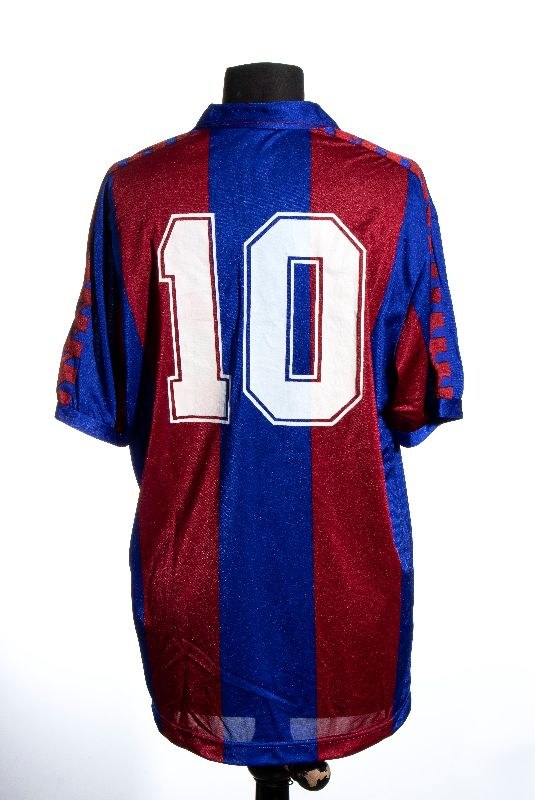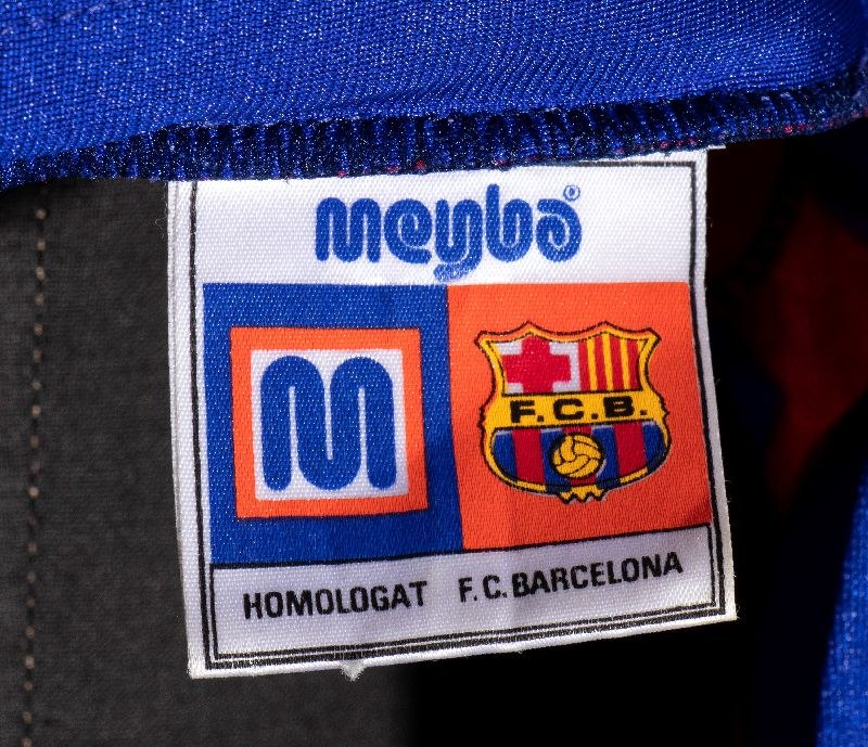 Barcelona home jersey, Blaugrana, 1983-84, produced by MEYBA Homologated FC Barcelona, short sleeves, size G.Inner label: DISTRIBUIDORA DEPORTIVA S/A BARCELONA. Perforated sleeves under the armpits.On the front: embroidered Meyba sports sponsor, embroidered Barcelona crest.On the back: sublimated number 10.Jersey issued/worn by Diego Armando Maradona, 1983-84 season. In perfect condition.Provenance: Argentine sports journalist