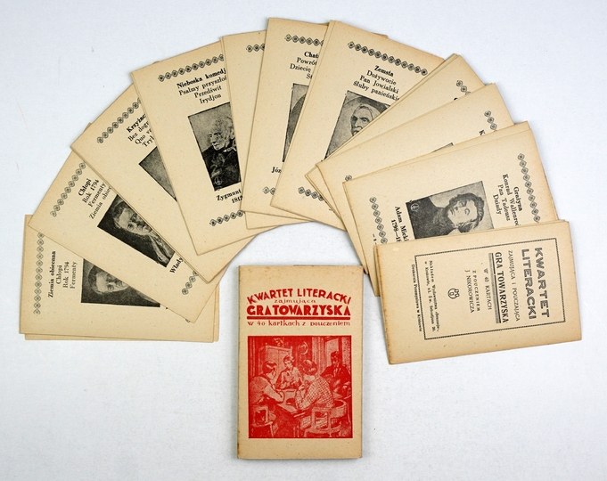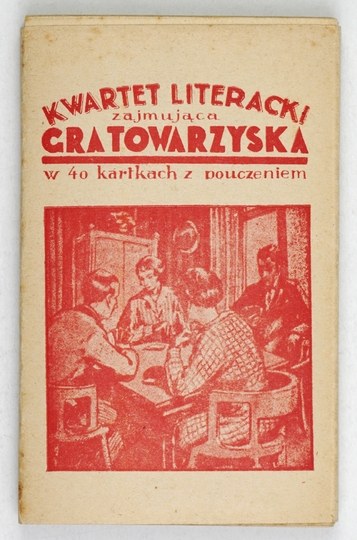 [KARTY, gra towarzyska]. Kwartet literacki. Zajmująca i pouczająca gra towarzyska w 40 kartkach. Z pouczeniem J. Nikorowicza. Nie przed 1930.