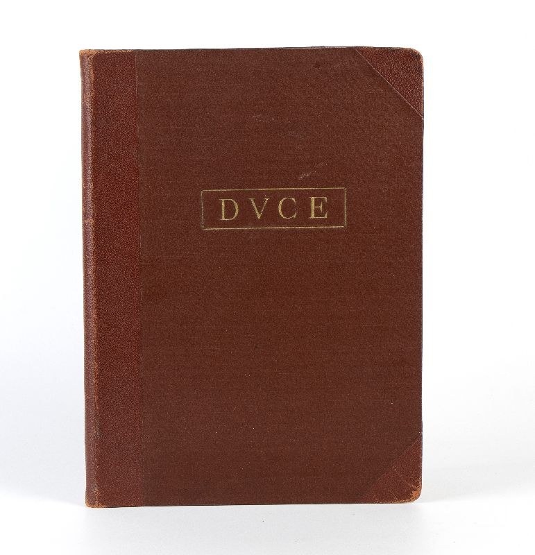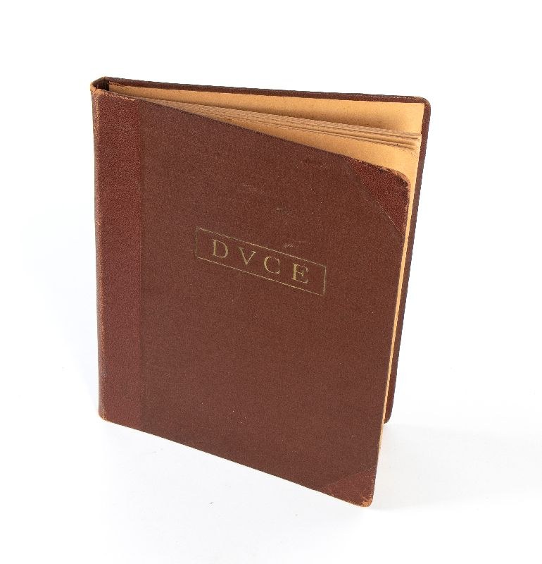 Hard cardboard folder, covered in imitation leather, with DUCE print in a box engraved on the plate in gold-plated characters, with cardboard pages to insert the letters that had to be brought to Mussolini's examination and consequently to his approval (or not) for signature. In excellent condition. Measures approximately cm. 26x35