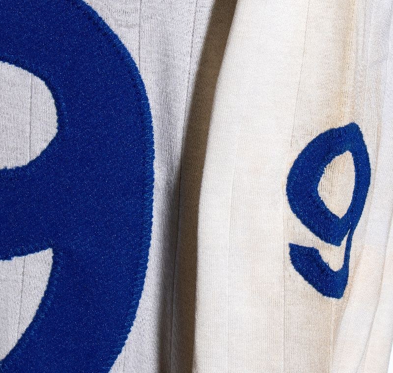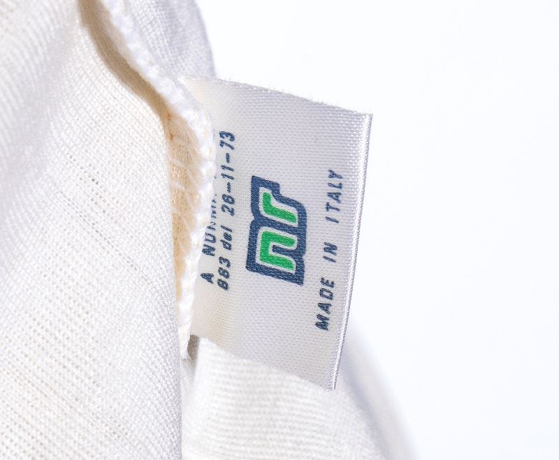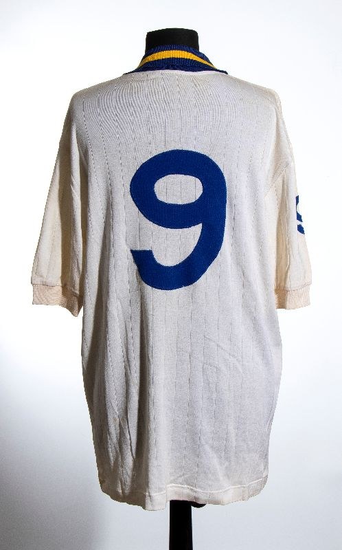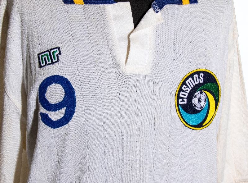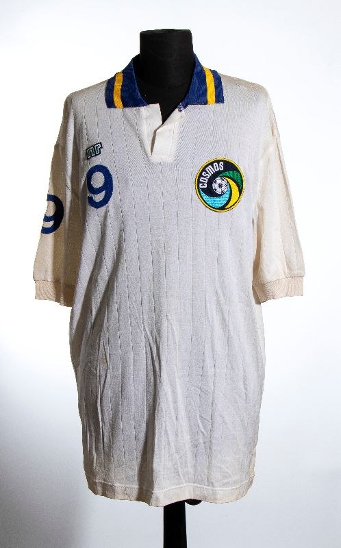 COSMOS short-sleeved jersey, white, ENNEERRE acrylic. Blue collar with yellow trim. Inside label: "According to Law 883 of 26-11-73 NR Made in Italy"Jersey issued by NR (Cosmos license), from stock, for Giorgio Chinaglia, from 1976 to 1983, when he played for the New York team, the N.Y. COSMOS.On the front: embroidered NR logo, stitched number 9, circular COSMOS logo embroidered.On the sleeves: stitched number 9 on the right sleeve.On the back: stitched number 9.In excellent condition.Provenance: Sports journalist, private collection.