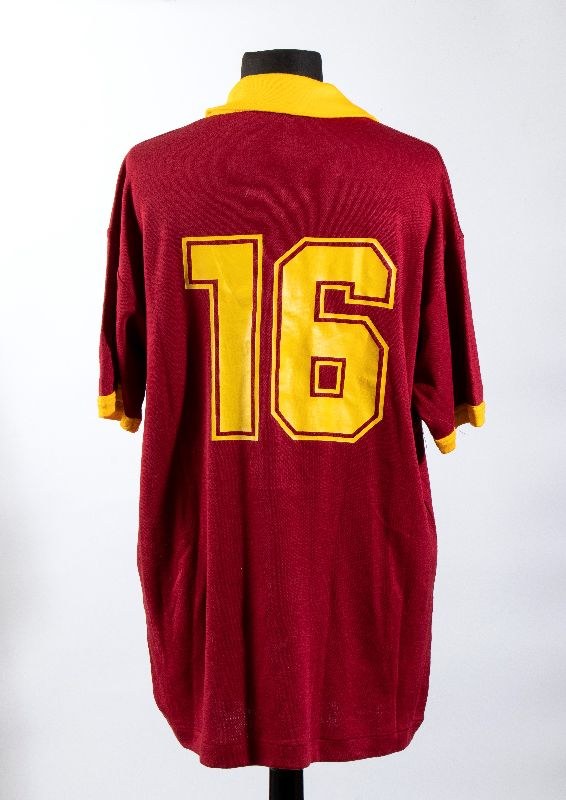 ENNERRE short-sleeved match jersey, Pompeian red with yellow trim, ENNERRE internal label, Made in Italy, 100% acrylic - Size L - other label CTR G.Front: BARILLA sponsor applied using heat-sublimation printing, ENNERRE technical sponsor logo applied on the right, AS ROMA SPA embroidered patch applied on the leftBack: number 16 in sublimation/heat-treatedThis jersey was issued/used during the 1990-91 season and can be attributed to one of the players: Bruno Conti, Ruggiero Rizzitelli, Fausto Salsano, or Roberto Muzzi, who wore the number 16 that season. They were unable to obtain precise information from the family due to the obvious lack of a "conferente."In perfect condition.Provenance: Sports journalist, private collection
