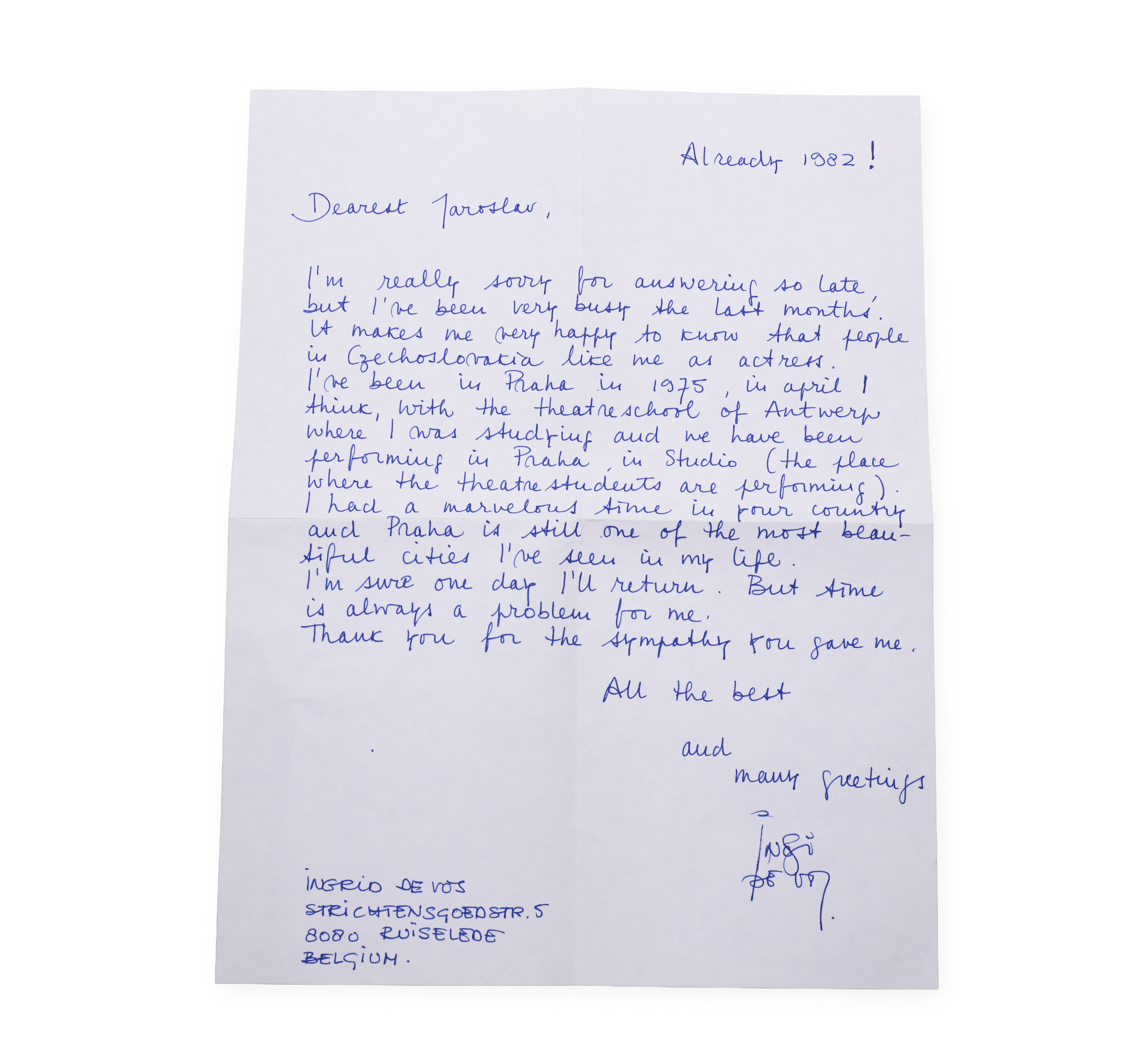 Ingrid De Vos – Belgian actress. Handwritten letter addressed to Jaroslav Kovář with signature in full name from 1982, an authentic document connected with her acting career.___________________________________________________________________________