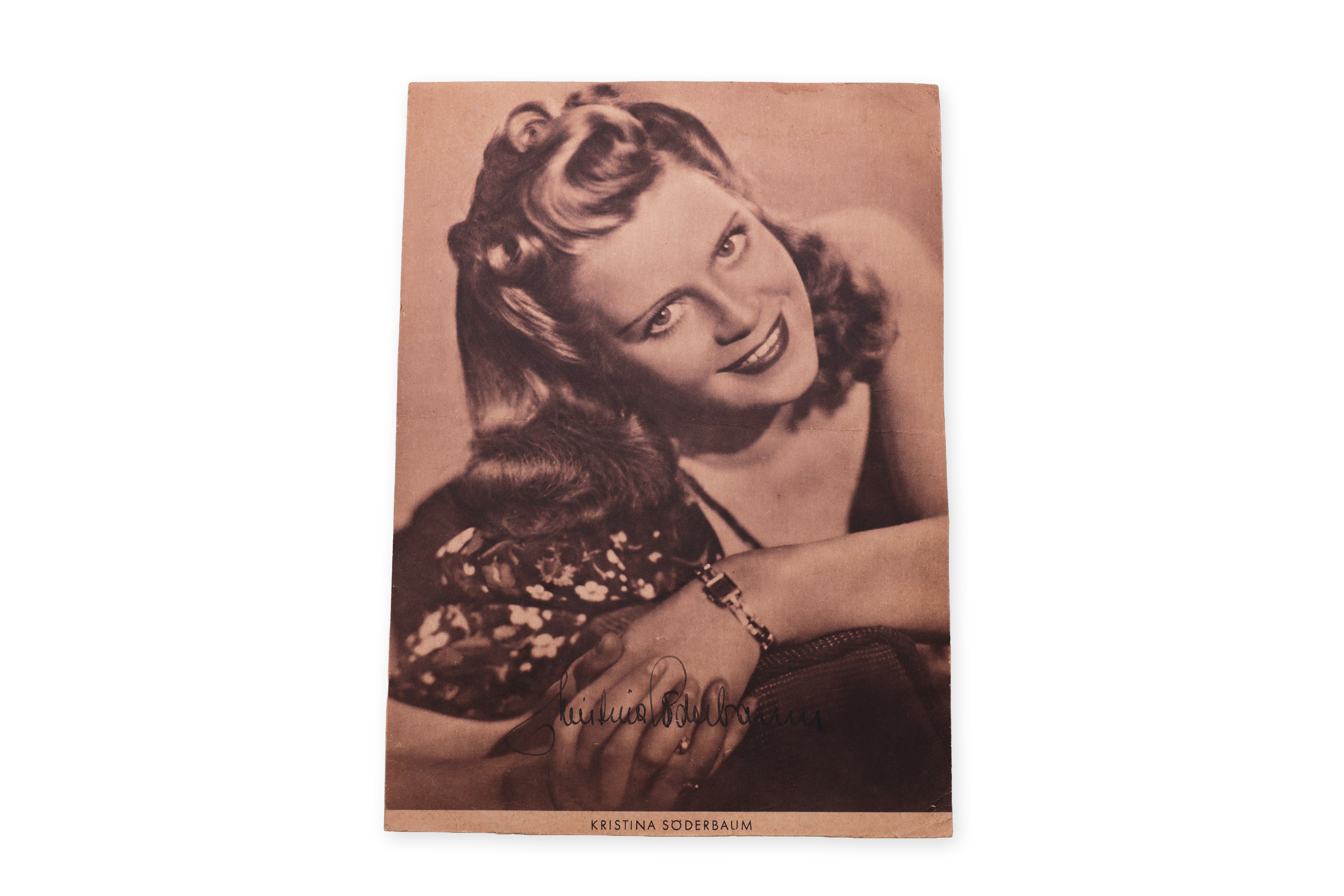 Photo of actress Kristina Söderbaum with printed name and her full name handwritten signature. Kristina Söderbaum (1912–2001) was a Swedish-German film actress, best known for films of German cinema in the 1930s and 1940s. The document has both collectible and historical value.___________________________________________________________________________