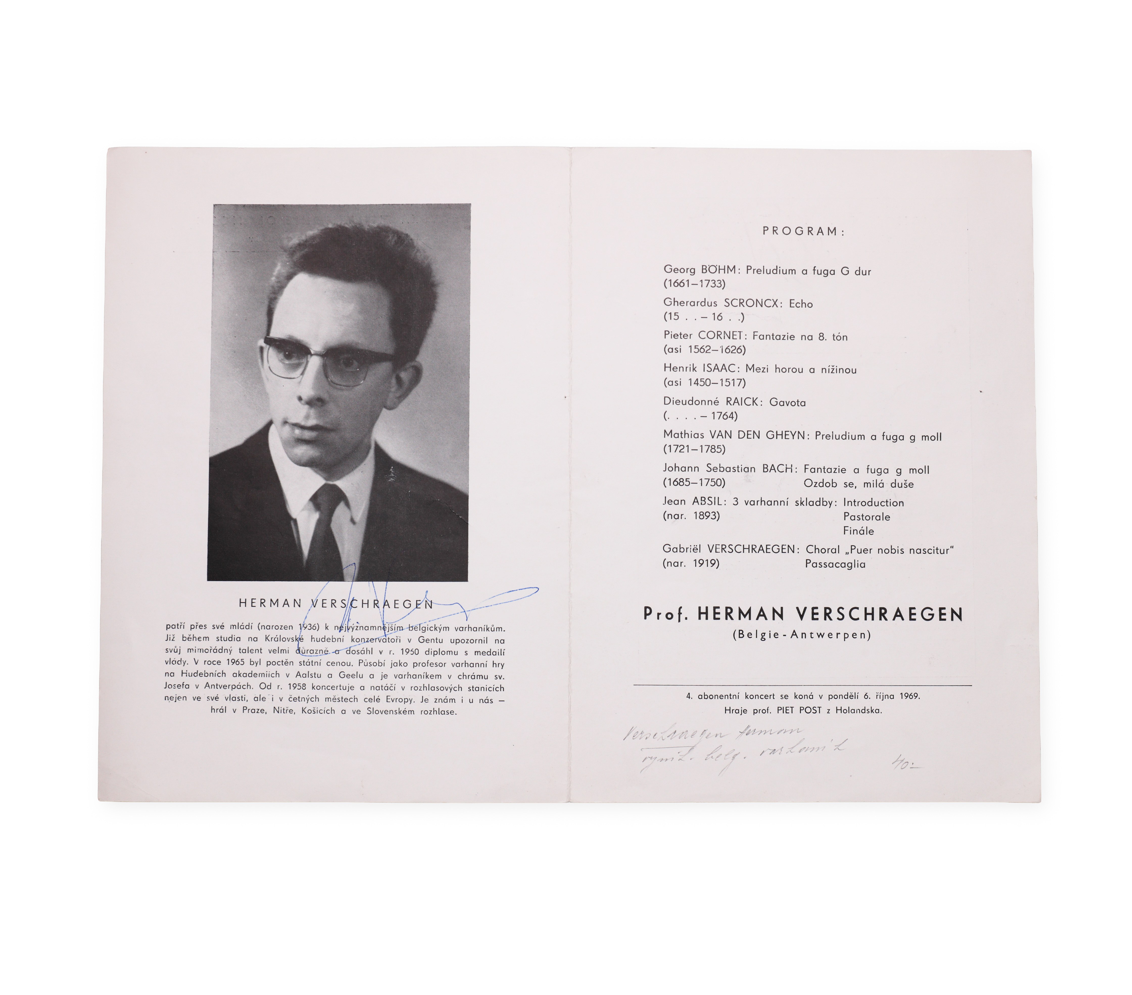 Signature of the personality on his photograph in the program for the "International Organ Festival Olomouc", dated 6 October 1969. Herman Verschraegen was a Belgian organist who specialized in the interpretation of baroque and romantic organ music. He performed at international festivals and also worked as a teacher and church musician.___________________________________________________________________________