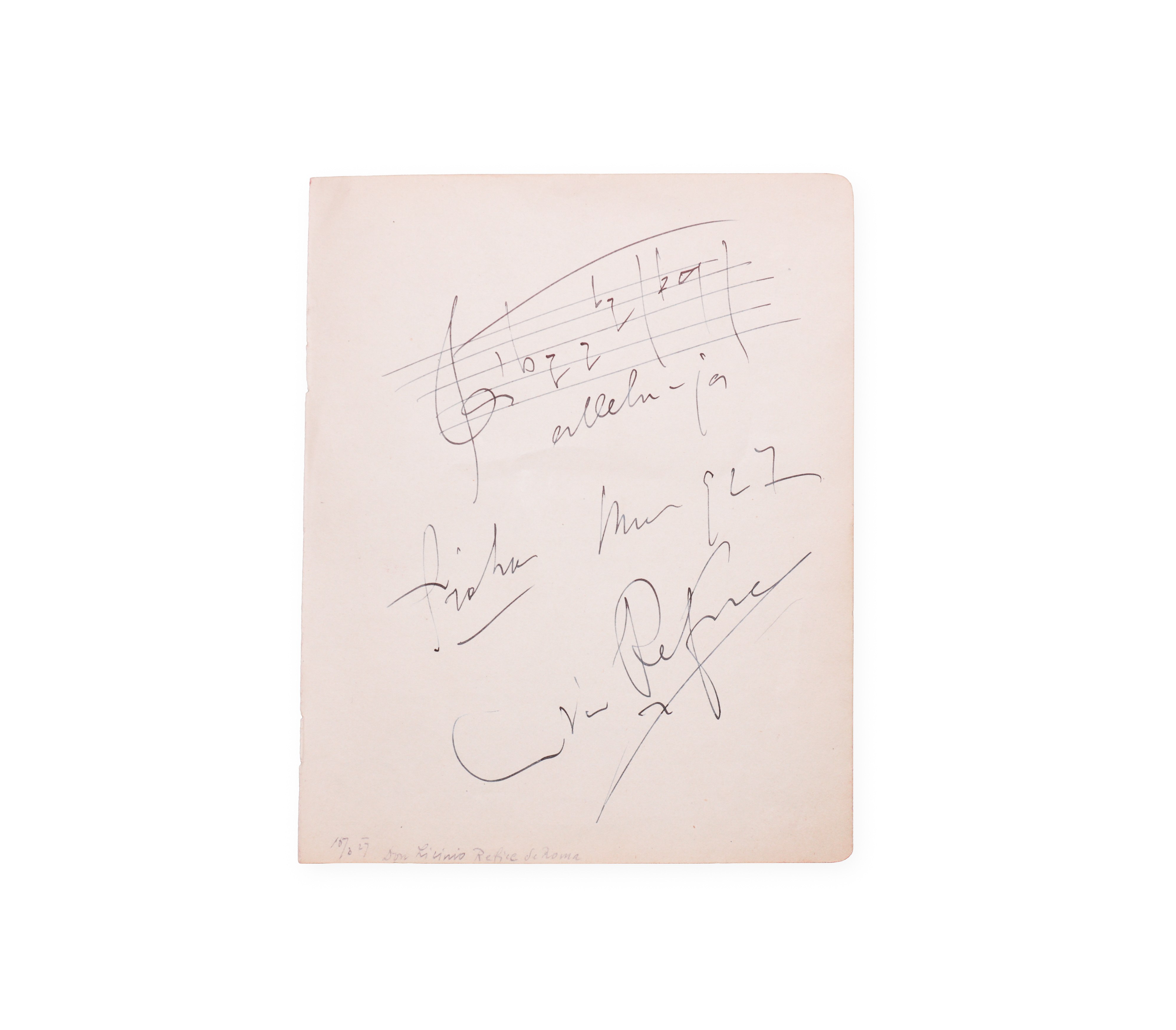 Personal signature with handwritten dating and location with musical notation on a scrap of paper, dated May 1, 1927. Licinio Refice was an Italian priest, composer and music teacher, known primarily for his spiritual and operatic works. His most famous opera is *Cecilia*, which became an important part of the Italian musical repertoire of the first half of the 20th century.___________________________________________________________________________