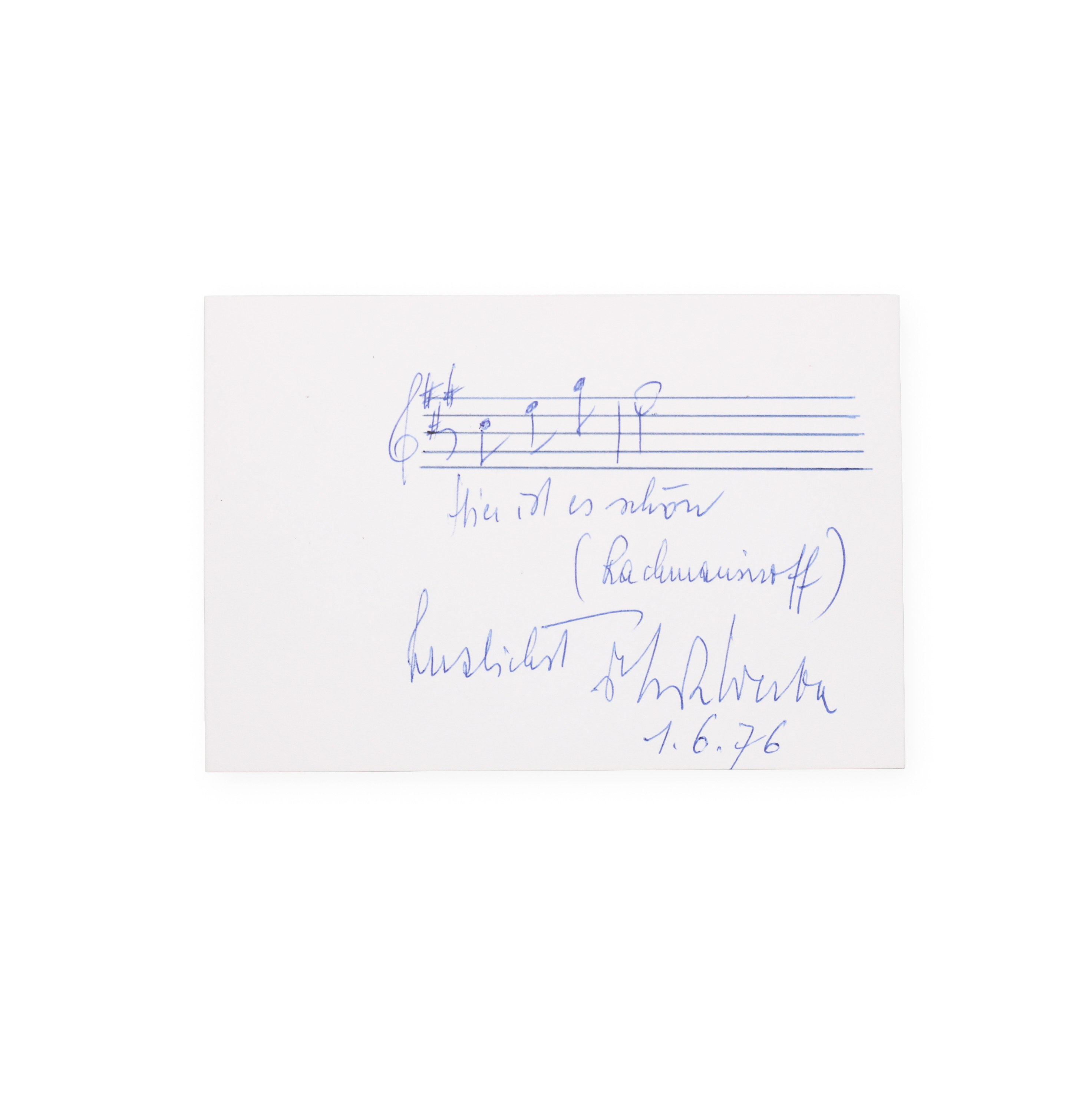 Signed in full name with handwritten dedication and notation on autograph card, dated 1/6/1976. Erik Werba was an Austrian pianist, conductor and music theorist, best known as an accompanist and performer of song repertoire. He collaborated with a number of leading singers of his time and also worked as a teacher at the Vienna Hochschule für Musik.___________________________________________________________________________