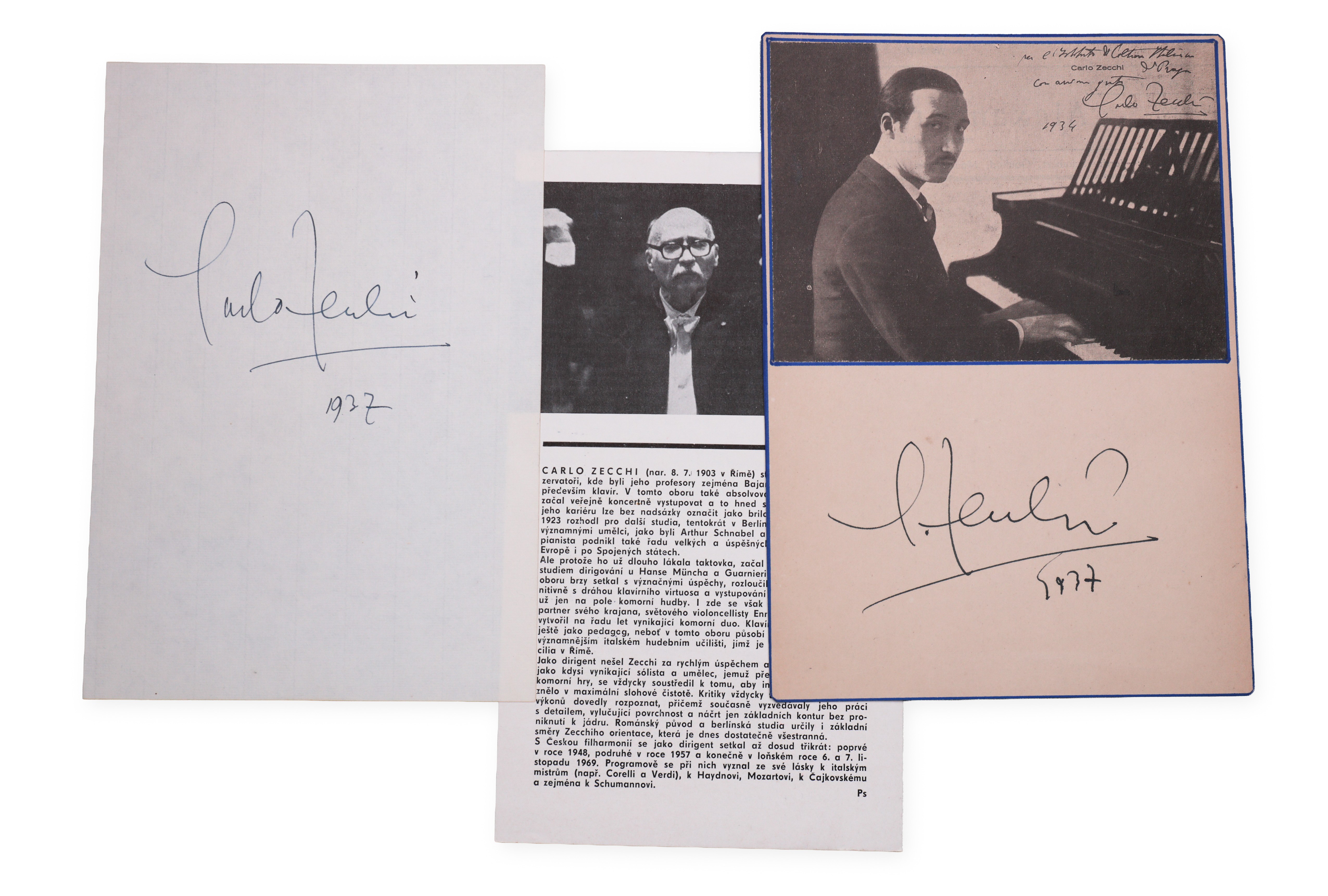 Carlo Zecchi's signature on a paper clipping dated 1937 and a second signature on his portrait photograph from the same year, accompanied by an informative text about the personality. Carlo Zecchi was an Italian pianist, conductor and pedagogue, known for his delicate, lyrical playing and deep musical feeling. He devoted himself mainly to the interpretation of Chopin, Debussy and Scarlatti and later became a recognized teacher of a new generation of pianists.___________________________________________________________________________