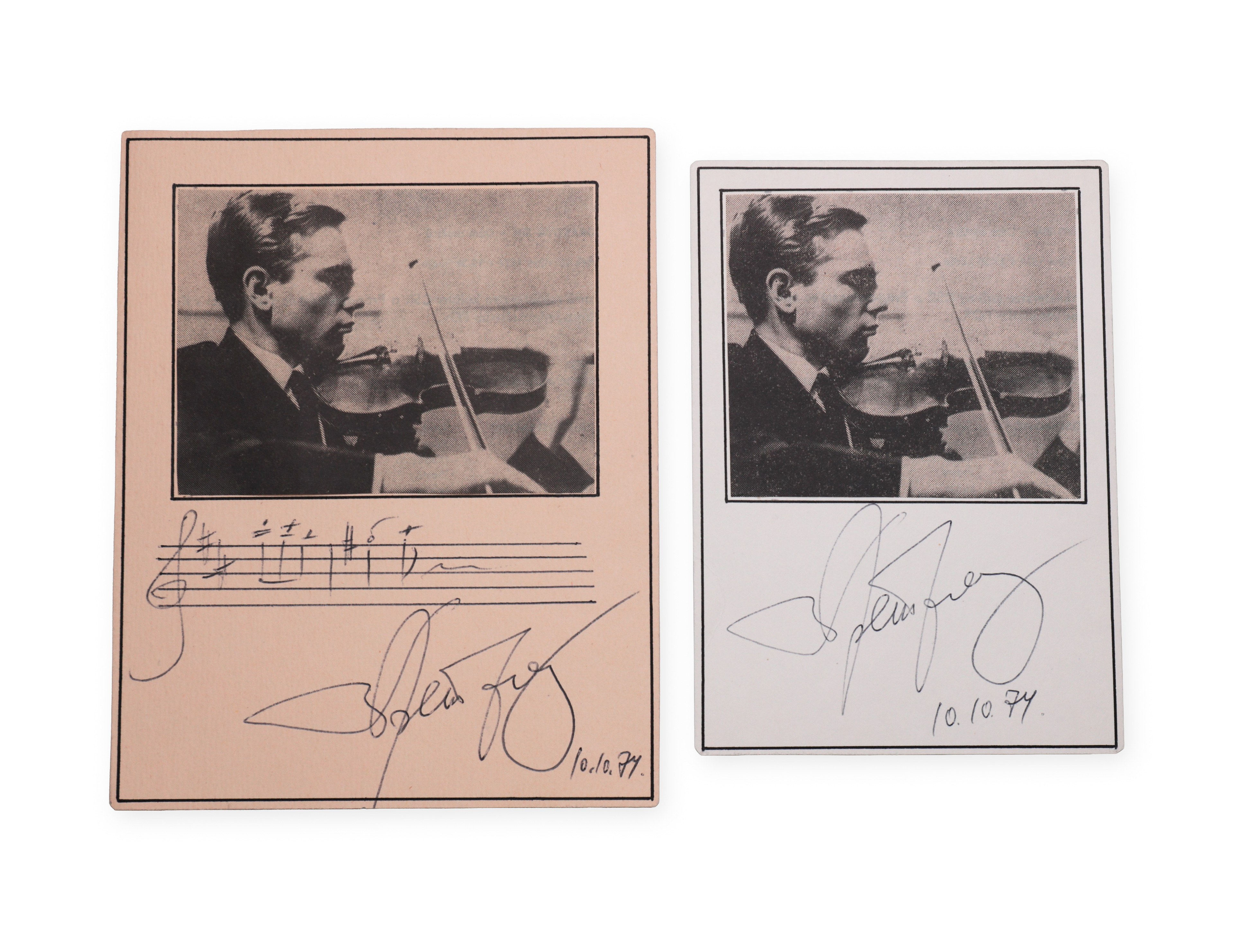 Viktor Viktorovič Tretyakov's signature on his portrait photo and the second signature on another photo, complete with musical notation, dated October 10, 1974. Tretyakov is a Russian violinist and conductor, renowned for his brilliant technique and mastery of expression. The winner of the Tchaikovsky Competition became an important figure on the world music scene and a recognized performer of classical and modern repertoire.___________________________________________________________________________