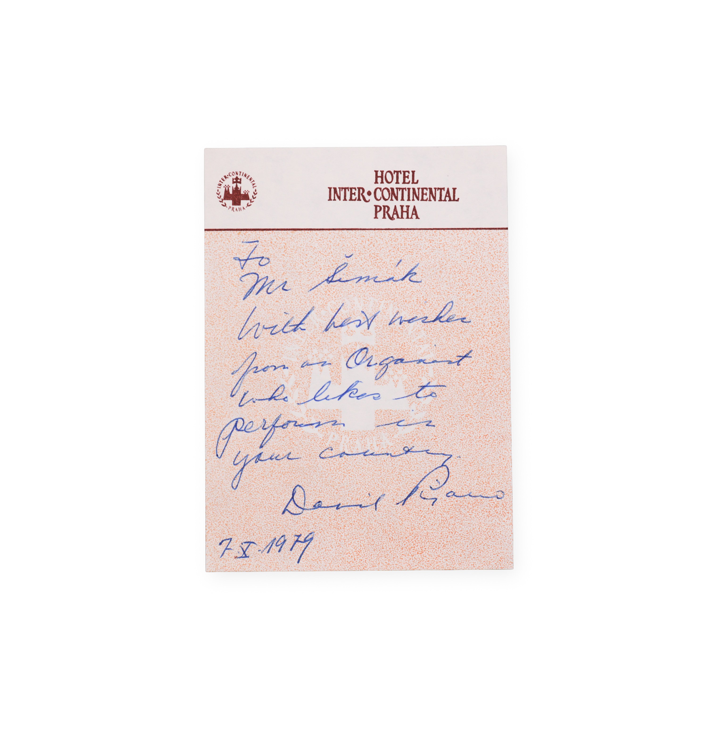 Handwritten signature with full name on a scrap of paper with the heading "hotel Inter-Continental Praha", dated October 7, 1979. The author is Pizzaro, probably an organist active in the second half of the 20th century. Although the available information about this personality is limited, the document testifies to her visit to Prague and contact with the musical environment during the period of cultural exchanges between the West and Eastern Europe.___________________________________________________________________________