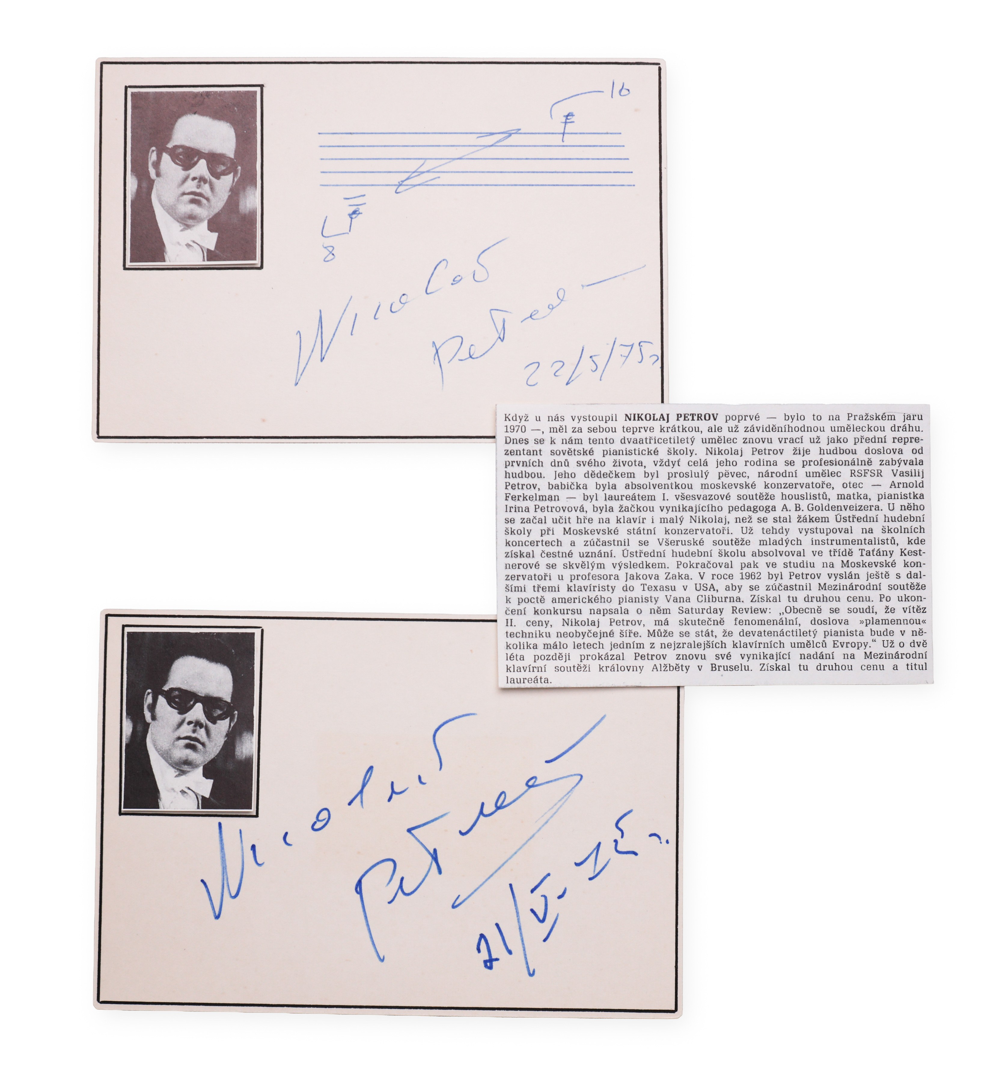 Autograph card of the Russian pianist Nikolai Arnoldovich Petrov dated May 22, 1975, with his handwritten signature, pasted photo, handwritten notation, location and date. The second card contains a personal handwritten dedication with a signature and is also accompanied by a newspaper clipping with information about the artist. Nikolay Petrov was one of the most prominent Soviet pianists of the second half of the 20th century, famous for his brilliant technique, deep feeling for the romantic repertoire and winning international piano competitions.___________________________________________________________________________