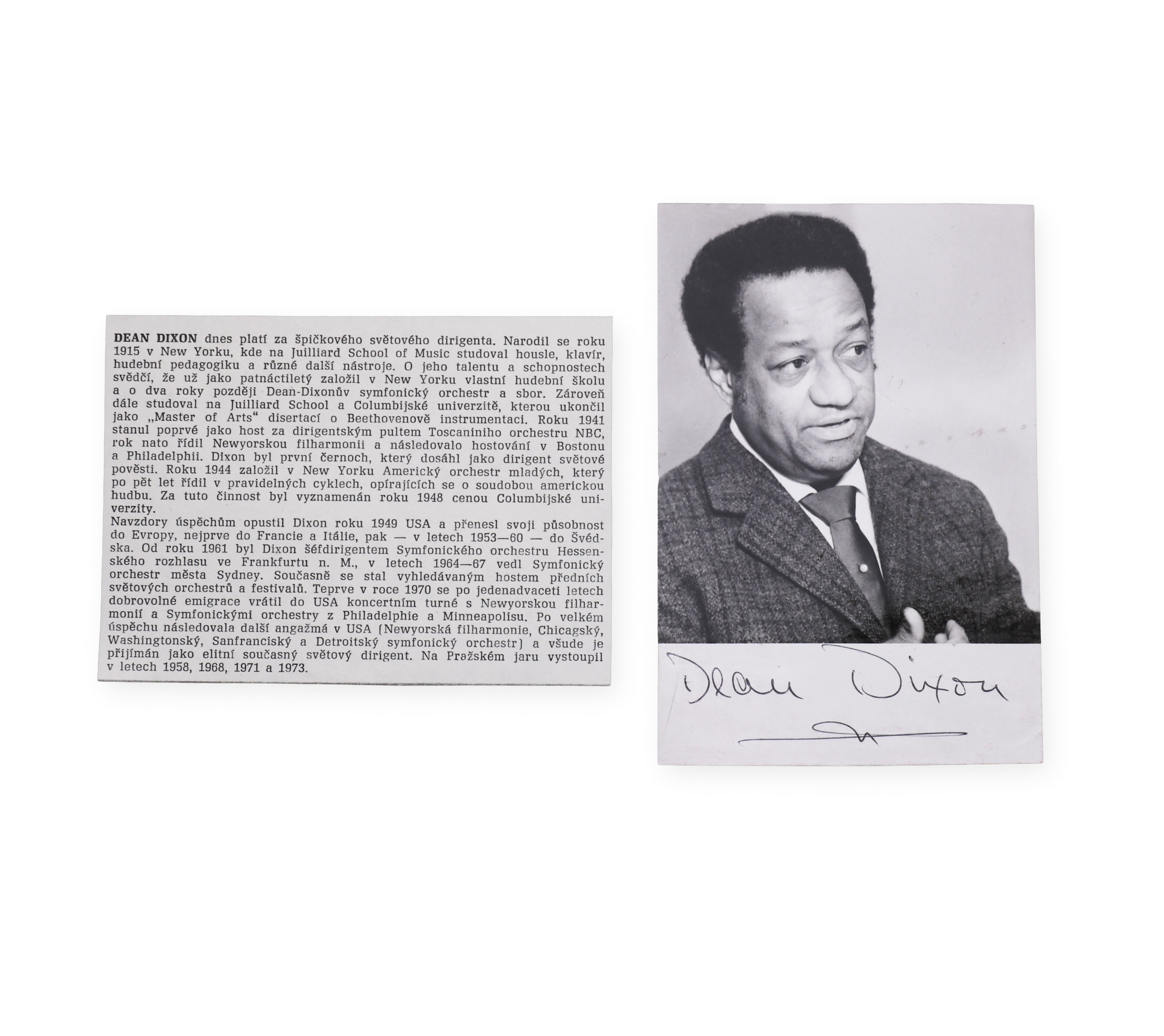 Signed black and white photo with informative newspaper clipping. Charles Dean Dixon was an American conductor who established himself especially in Europe, where he led important orchestras in Germany, Sweden and Austria. He was one of the first African-American conductors of international importance and championed equality in the music world.___________________________________________________________________________
