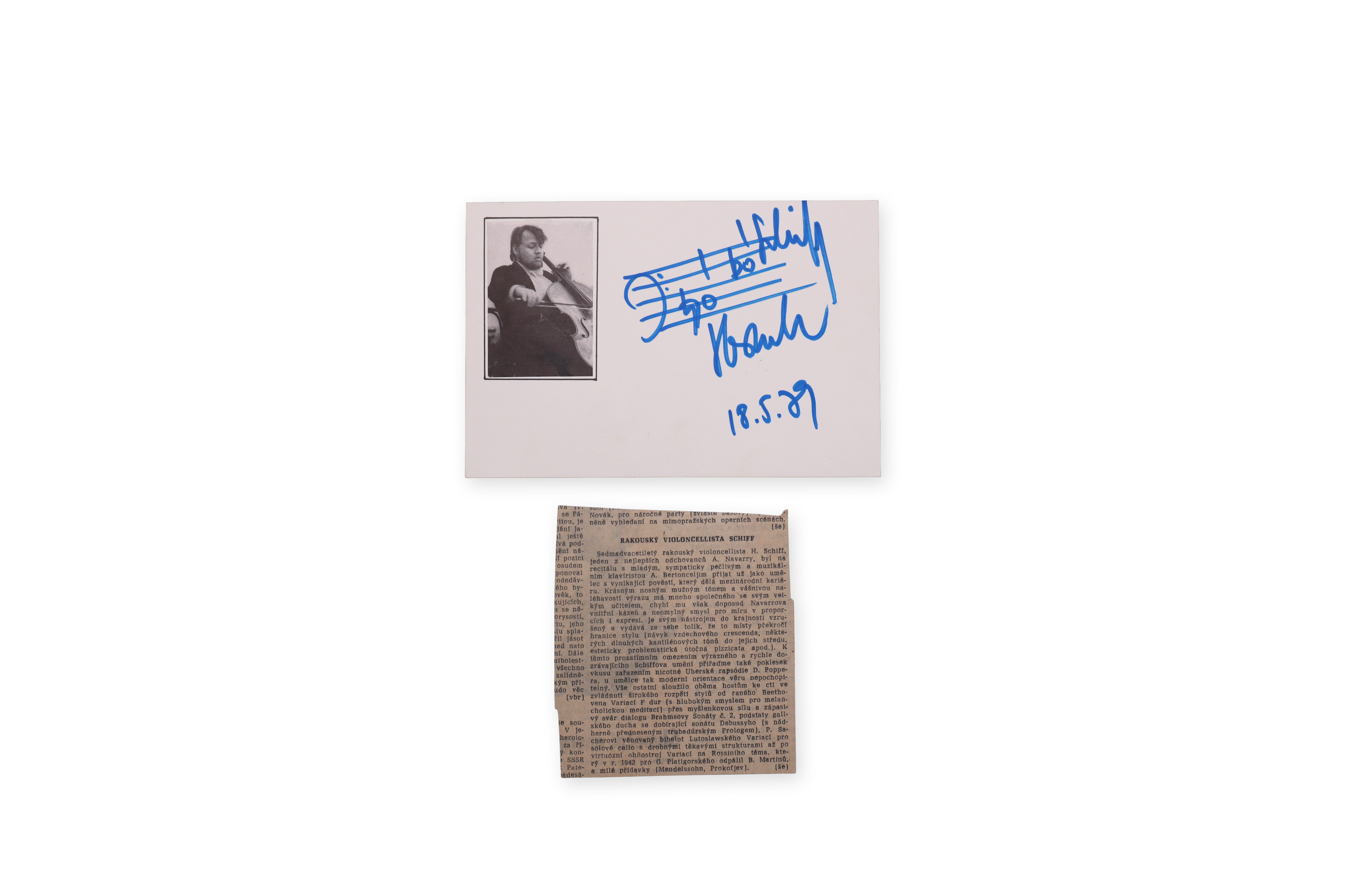 Signature of Heinrich Schiff on autograph card with handwritten sheet music and portrait photograph, dated May 18, 1989, accompanied by an informative newspaper clipping about the personality. Heinrich Schiff was an Austrian cellist and conductor of world renown, valued for his technical brilliance and deep musical expression. This collection represents an authentic monument to his artistic career during the peak of his international career.