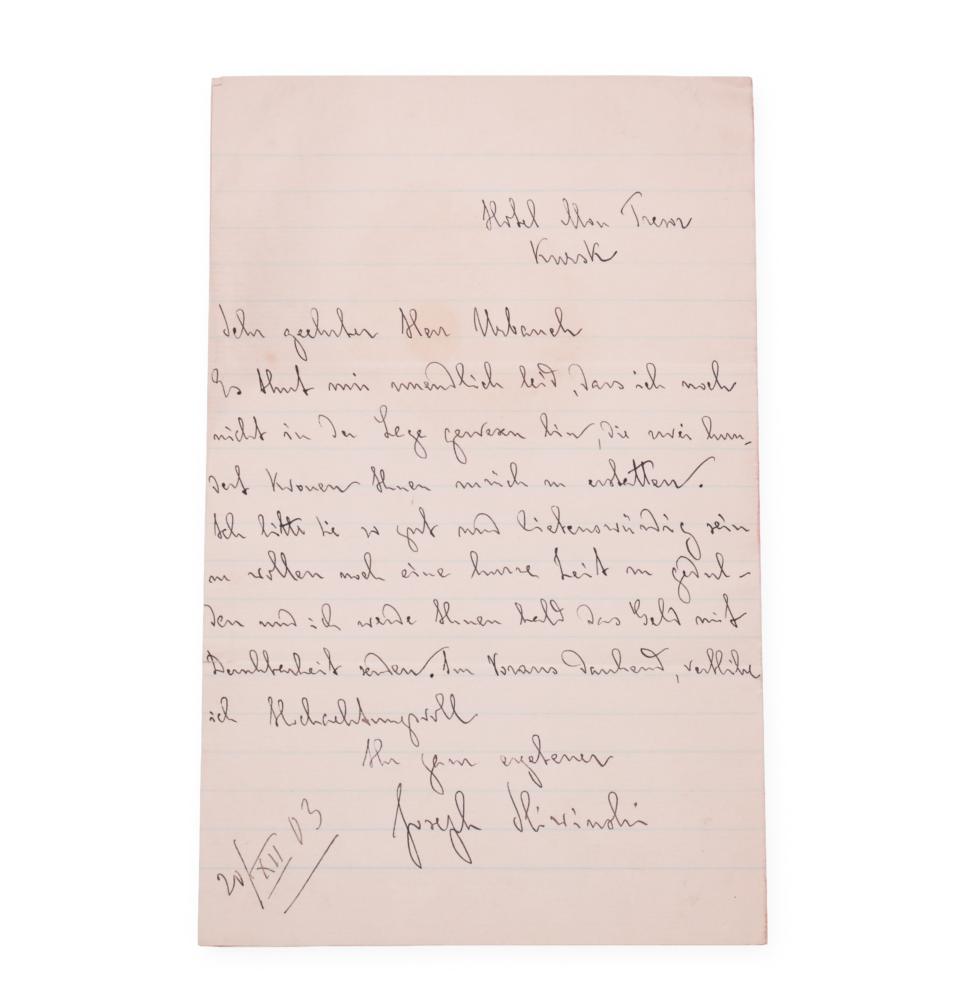 Handwritten letter signed by Józef Śliwińský, dated 20 December 1903 (*20/XII/03*). Józef Śliwiński was an important Polish pianist and pedagogue, known for his interpretation of the Romantic repertoire and his work on European concert stages at the turn of the 19th and 20th centuries. The letter represents a personal document from the period of his active artistic career and documents contact with his contemporaries.