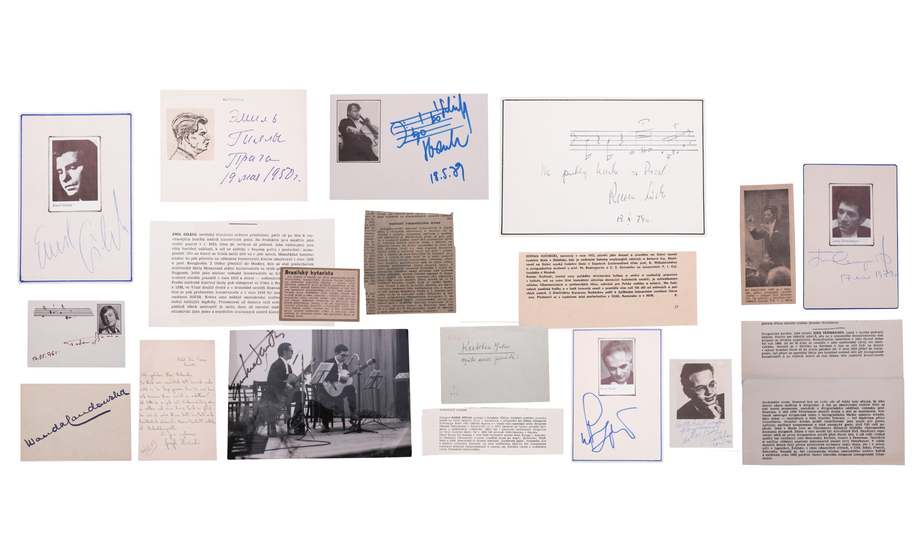 One autograph card of Emil Grigorevich Gilels with his portrait photo and signature with his full name, the other card with a photo and handwritten dedication without signature, accompanied by an informative newspaper clipping about the personality, dated May 19, 1950. Emil Gilels was one of the most important Russian pianists of the 20th century, renowned for his masterful command of the piano, deep musicality and unmistakable style. This ensemble brings a unique insight into the personal presentation of the legend of the world piano school during his period of international recognition.