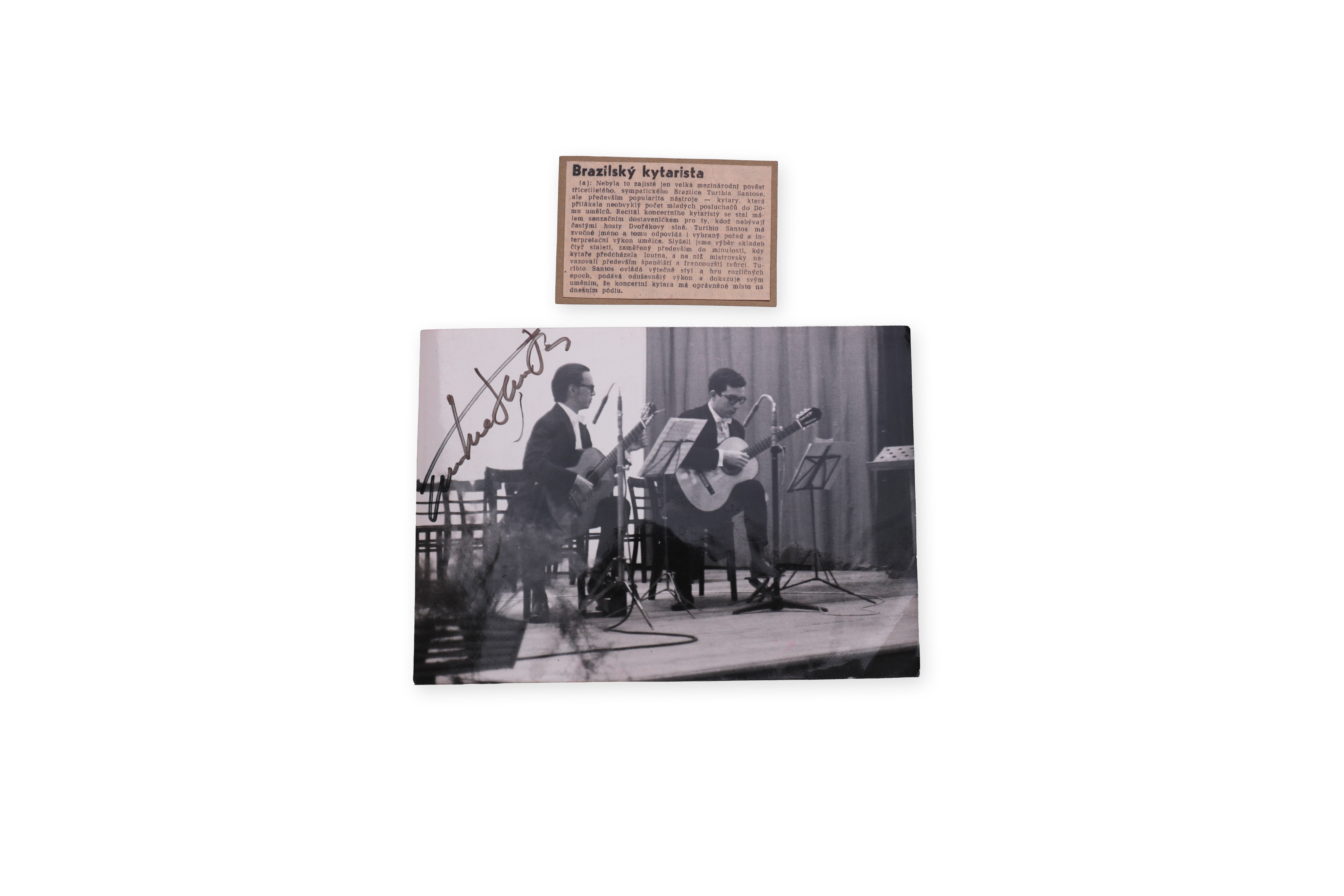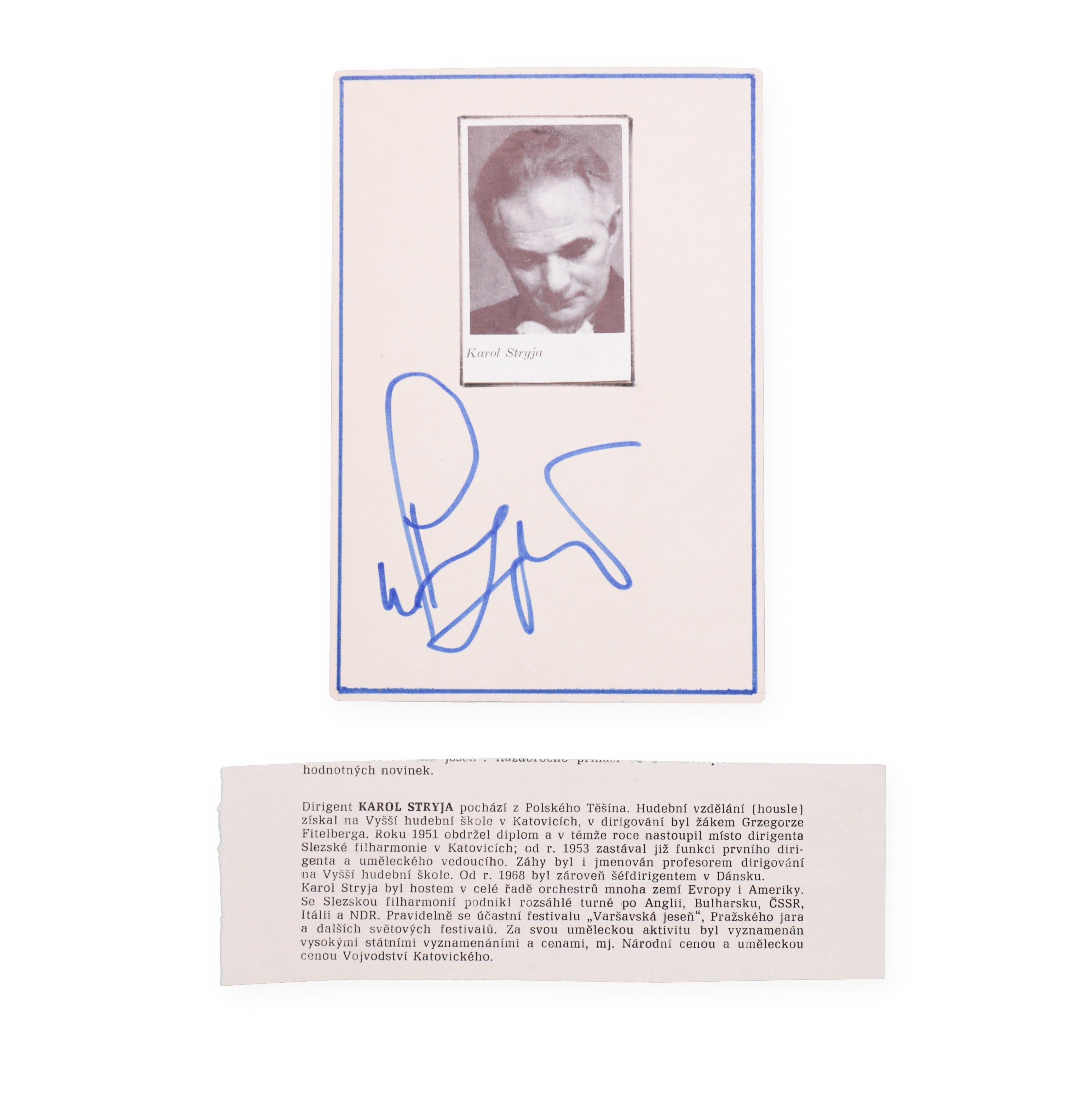 Karol Stryja's signature on a scrap of paper with his photo, complete with his printed name, and an informative newspaper clipping. Karol Stryja was an important Polish conductor and music pedagogue, who became famous especially for his work with the Silesian Philharmonic and his participation in international music festivals. This collection represents an authentic document of his public and artistic activity, captured during his active career.
