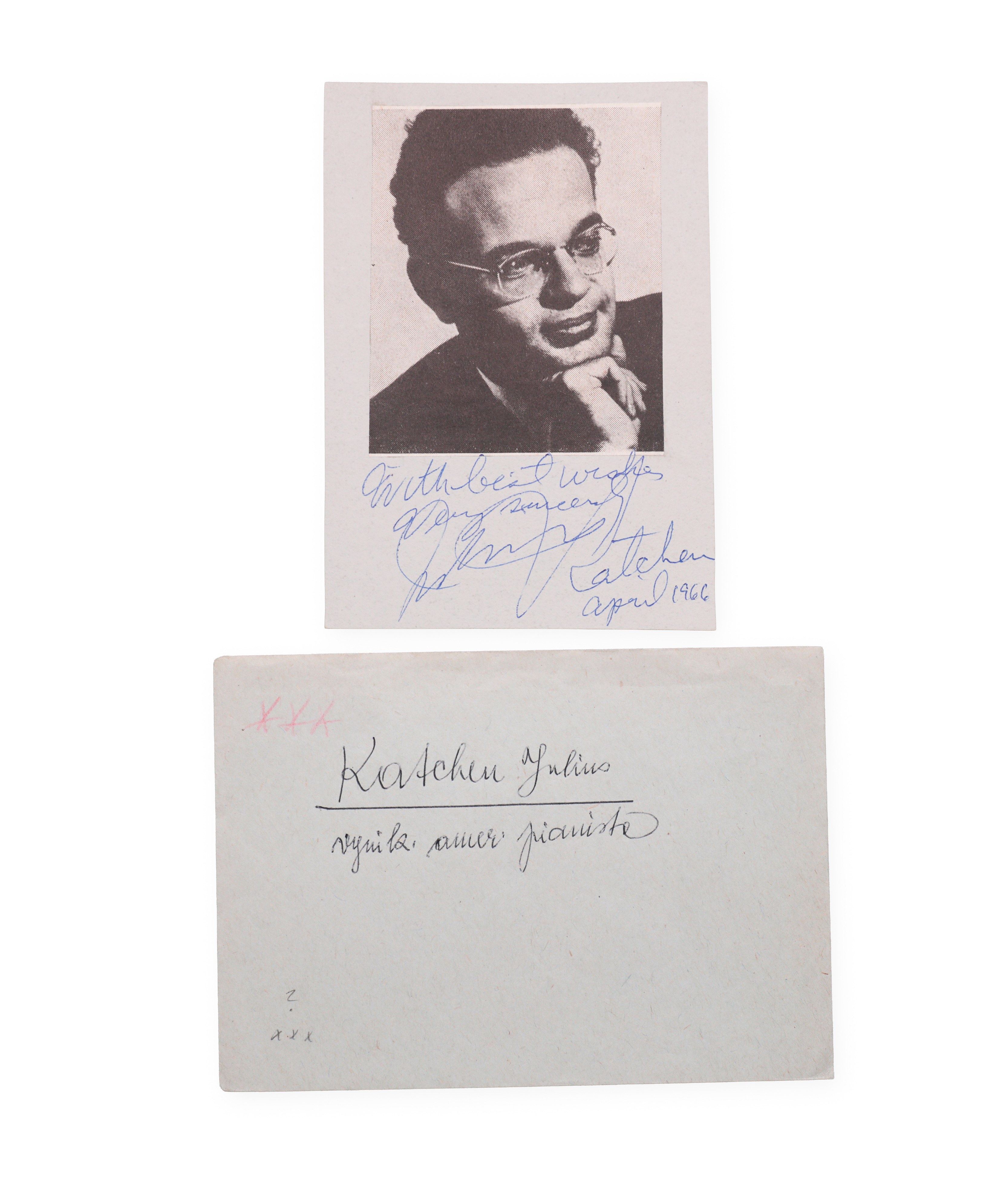 Signed photo of Julius Katchen with autograph dedication, dated April 1, 1966. Julius Katchen was an American pianist renowned for his brilliant technique and depth of interpretation, especially in the works of Johannes Brahms. He was one of the most outstanding pianists of his generation and performed on leading world stages. The dedication photo is a personal reminder of his artistic endeavours, at the end of his career.