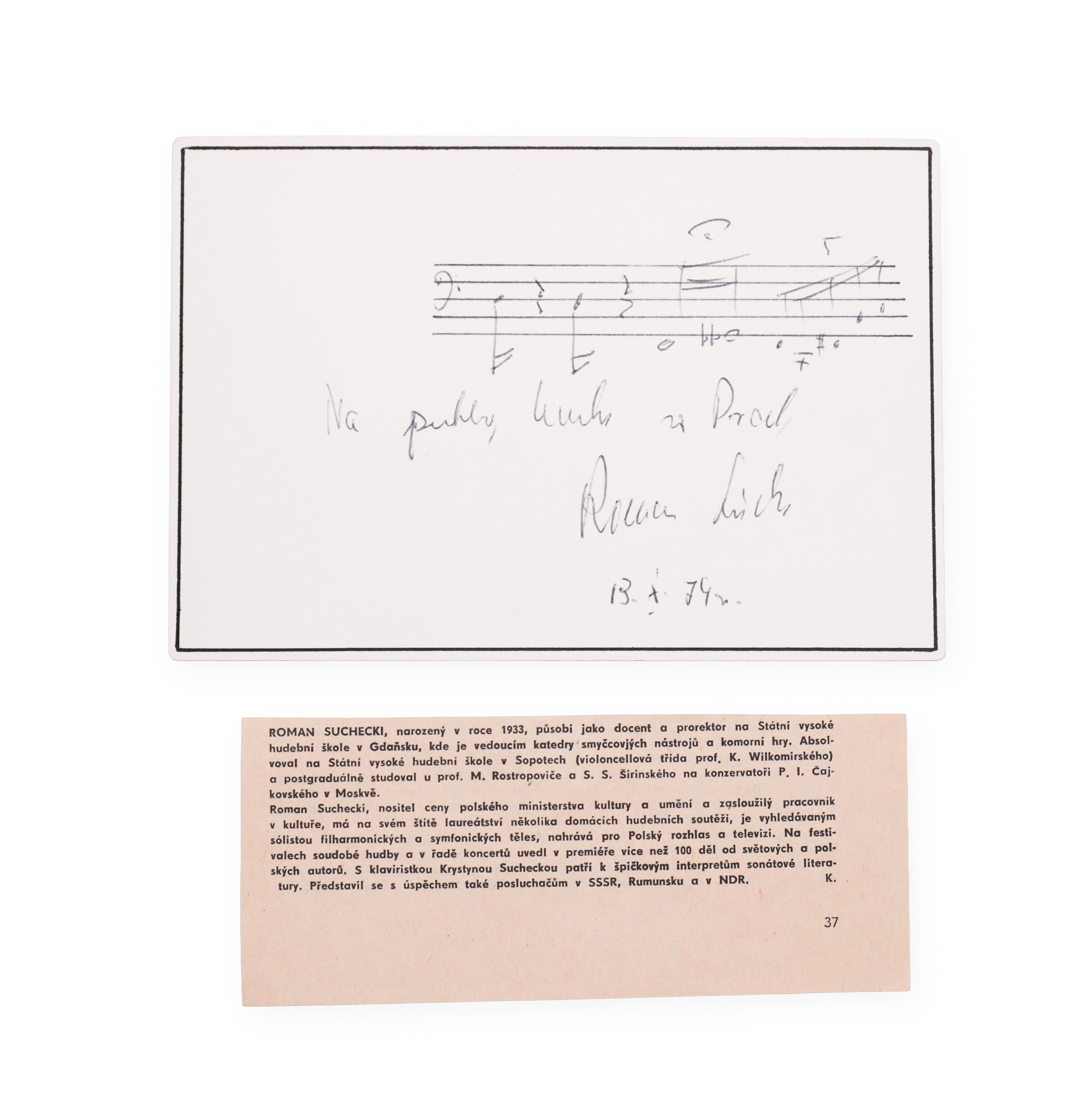 Roman Suchecký's signature on a scrap of paper with a handwritten dedication and notation, dated October 13, 1974, supplemented by an informative newspaper clipping. Roman Suchecki was a Polish music composer, pedagogue and cultural worker, active especially in the second half of the 20th century. This collection documents his personal and professional presentation and is a memorial to his work in the field of musical culture and education.