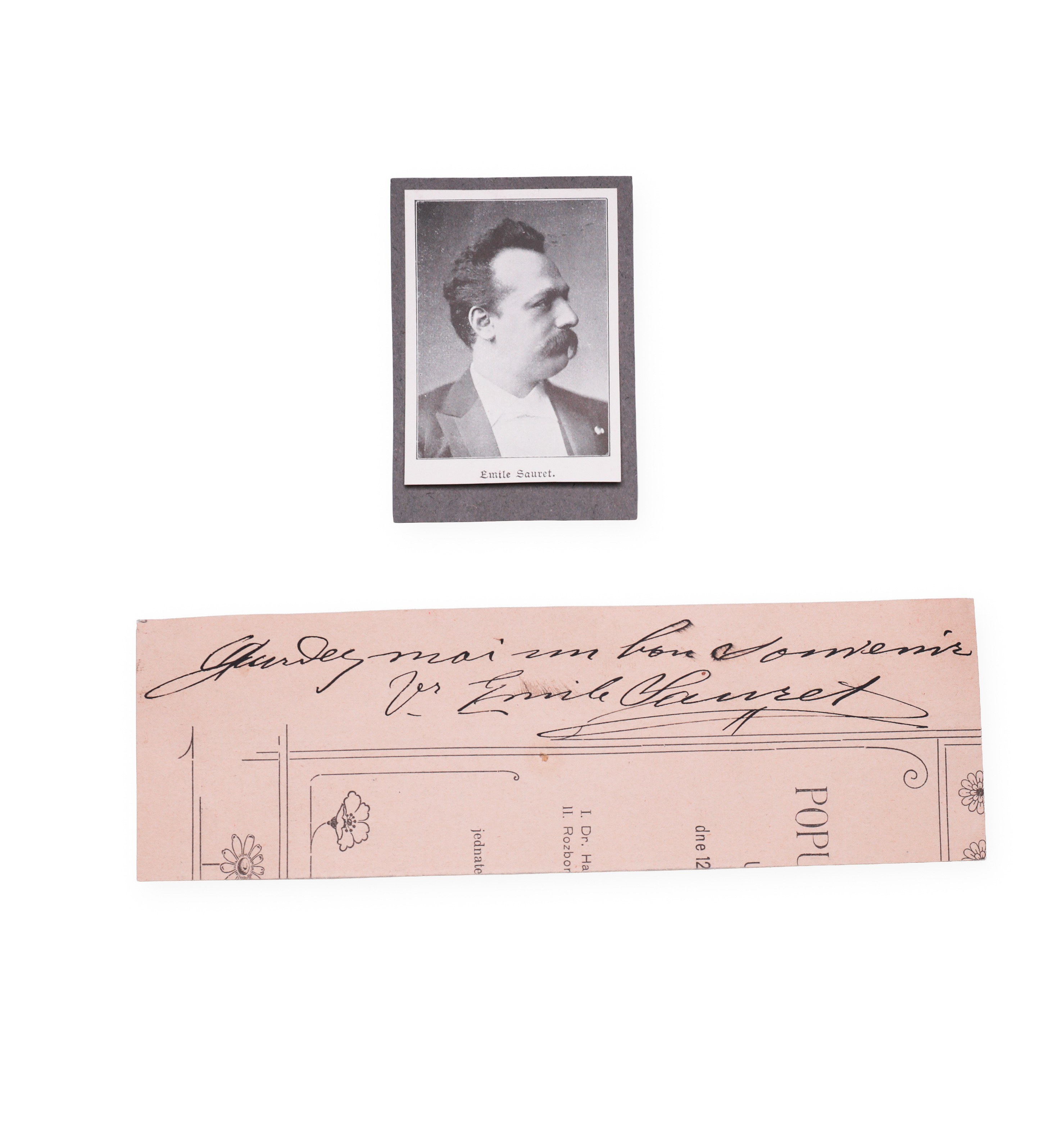 Emil Lauret's signature on a scrap of paper with a short handwritten dedication, accompanied by a portrait photograph with his name. Emil Lauret was a French musician and conductor, known for his work in the field of wind music and regional cultural life. The file represents a small personal reminder of his work and contact with the public through an autograph.