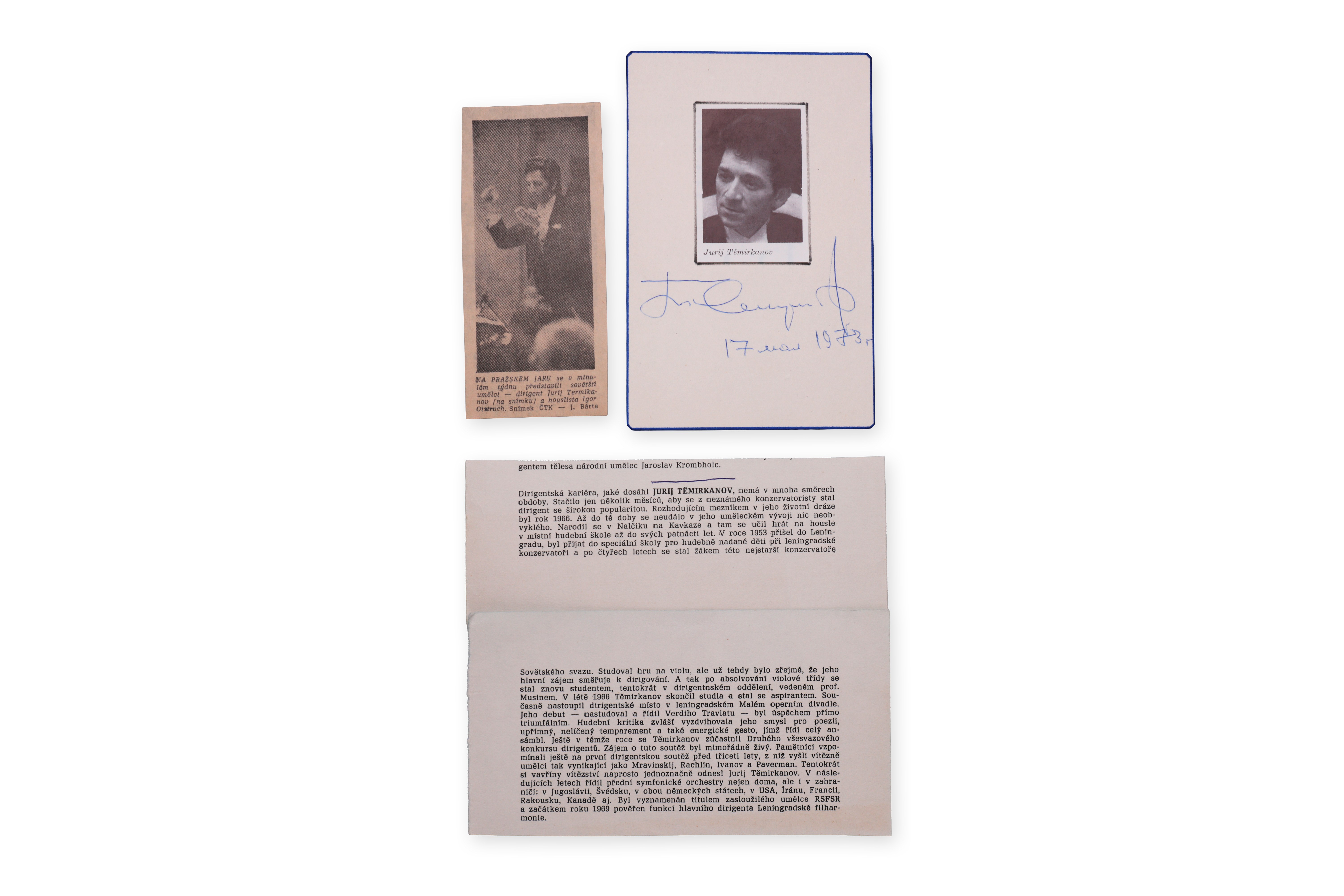 Signed photo of Yuri Khatuevich Temirkanov on a paper clipping, dated May 17, 1973, accompanied by two informative newspaper clippings and a newspaper photo of the concert setting. Yuri Temirkanov is an important Russian conductor, the long-time chief conductor of the St. Petersburg Philharmonic, known for his refined interpretation of the Russian and world symphonic repertoire. The collection documents his international activities during the peak of his career and reflects his prestige in the cultural space of the time.