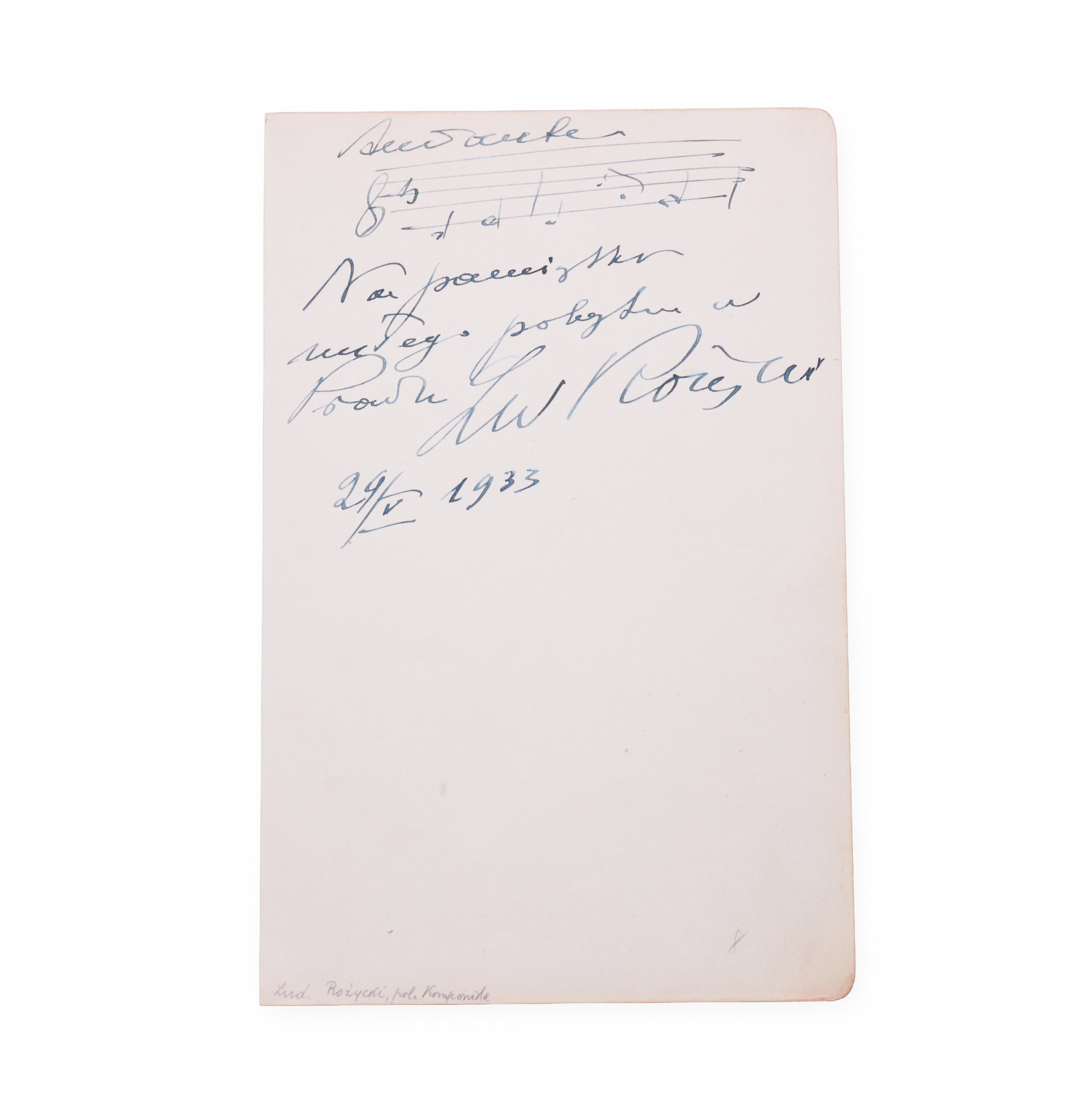 Signature of the prominent Polish composer Ludomir Różycký on a letter with musical notation, dated May 29, 1933. One of the main representatives of Young Poland in music, author of orchestral compositions, ballets and operas, whose work drew on national tradition and impressionistic color. Różycki was among the most prominent figures of the interwar Polish music scene.