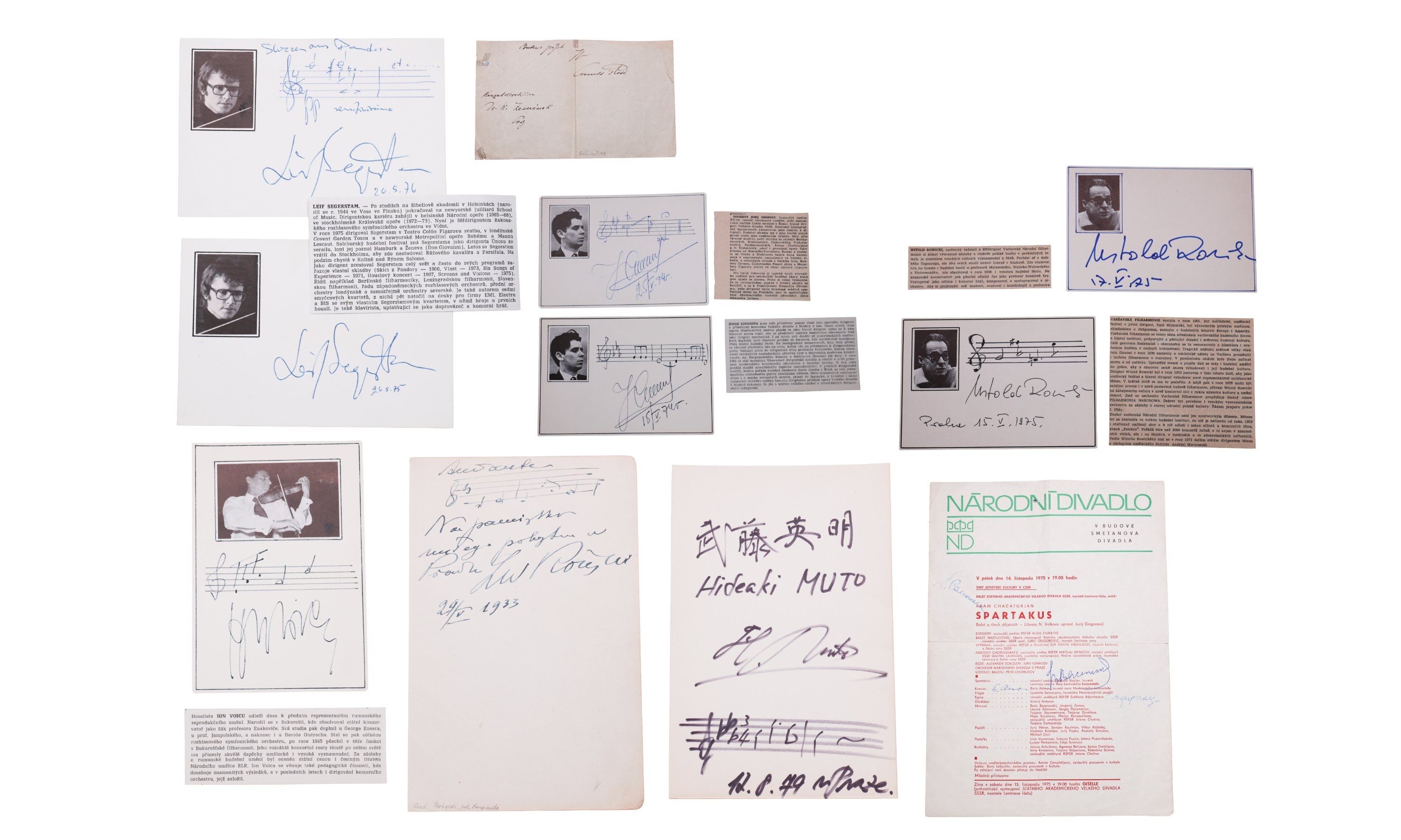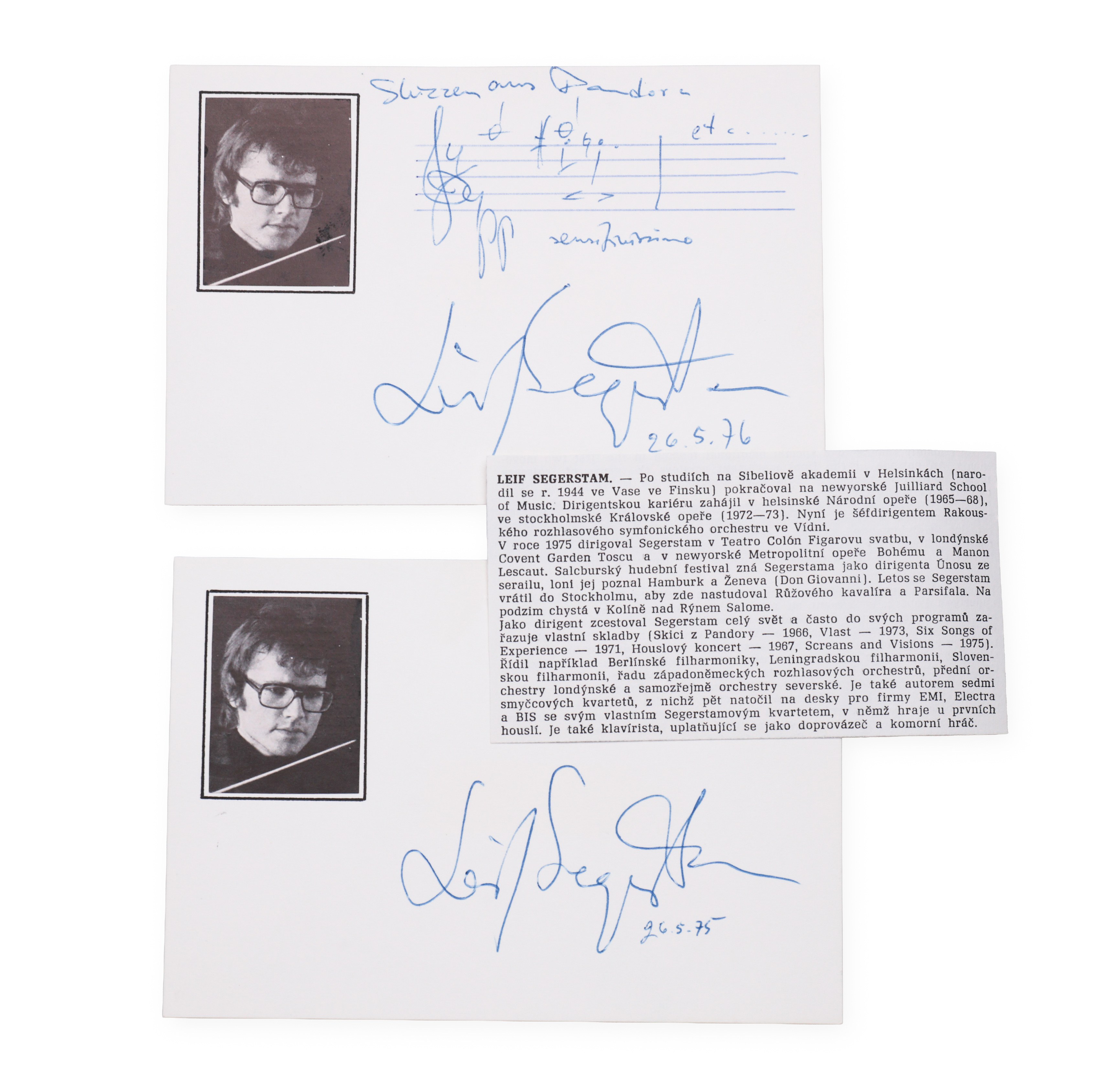 A pair of cards with the signatures of the Finnish conductor, composer and violinist Leif Segerstam, both with a portrait photograph, the first supplemented with musical notation and dated May 26, 1976, the second with a signature and dated May 26, 1975. Supplemented with an informative text about this charismatic personality known for his eccentric energy and monumental composition work, numbering hundreds of symphonies and an innovative approach to music improvisation.