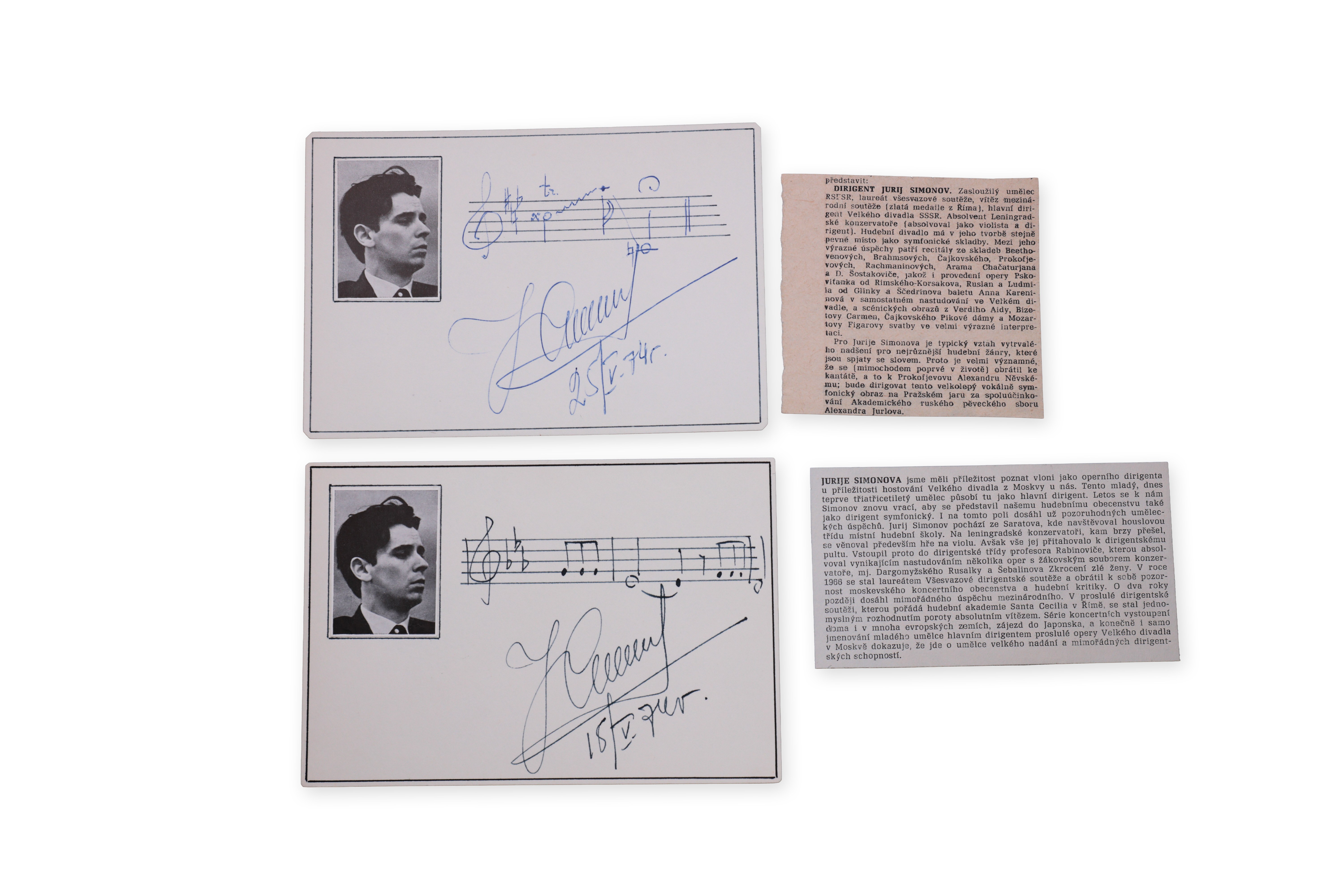 Two signature cards with musical notation of the Russian conductor Yuri Ivanovich Simonov, the first dated May 15, 1974, the second May 25, 1947. Completed with two informative texts describing the personality of this charismatic artist, who already established himself as an exceptional talent in his youth and later led the orchestra of the Bolshoi Theater and important European ensembles. He became famous for his spirited performances, his sense of dramatic construction and his extraordinary sense of interpretation.