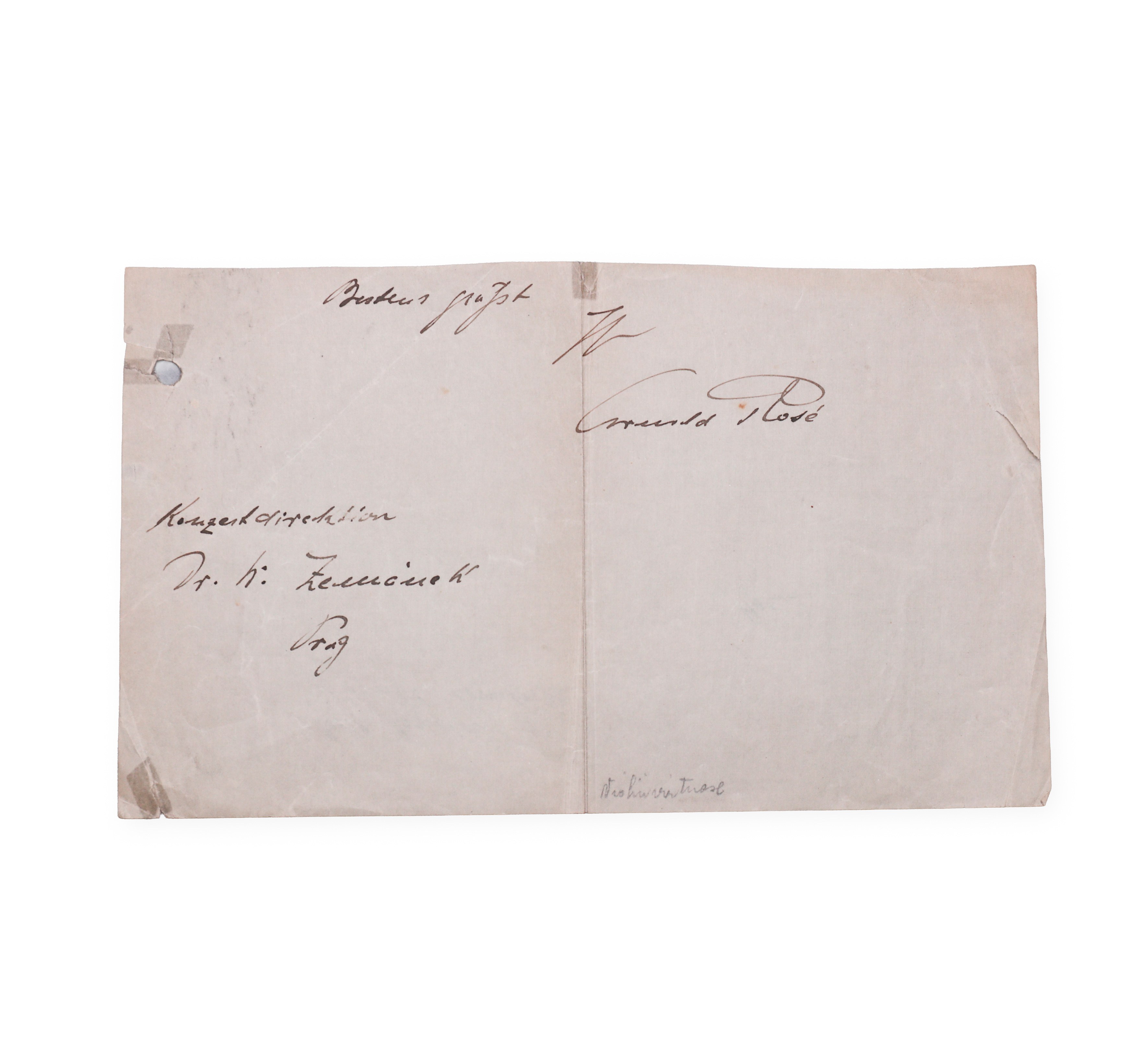 Signature of the Austrian violinist Arnold Rosé on an undated cut, taken in Prague. Longtime concertmaster of the Vienna Philharmonic and founder of the famous Rosé Quartet, he was one of the most renowned performers of his time. As the brother-in-law of Gustav Mahler, he was also an important promoter of his music. Rosé's playing stood out for its nobility, intonation purity and lyrical depth.