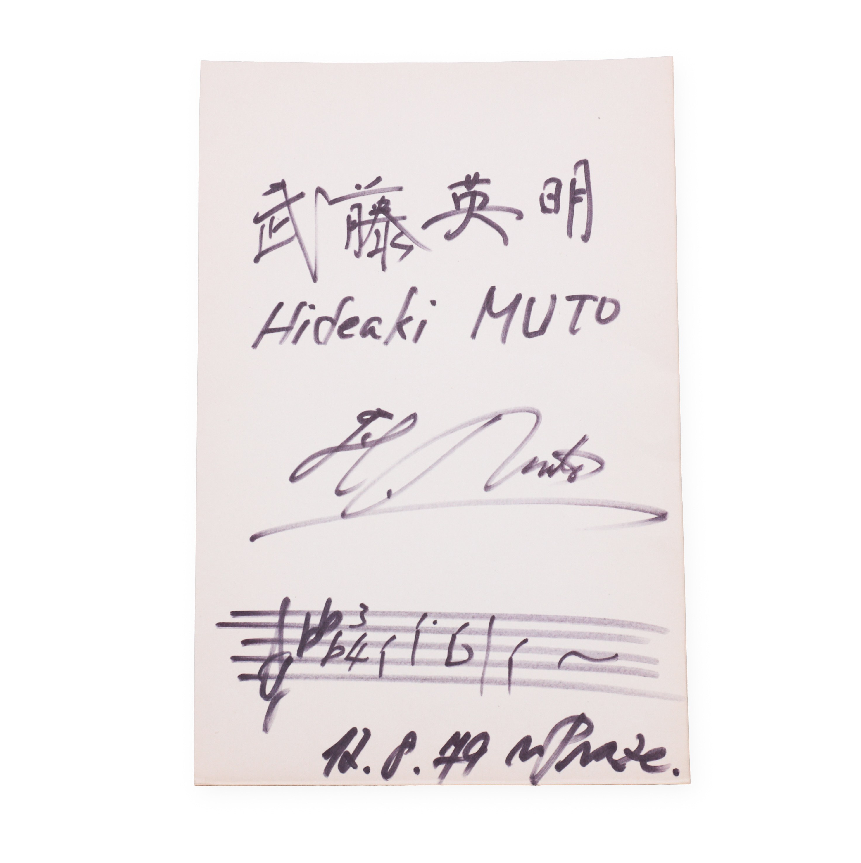 The signature of the Japanese composer and conductor Hideaki Muta, accompanied by a short notation and a handwritten message, dated August 12, 1979. The name is given in both Latin and Japanese characters (kanji), which underlines his desire for a cultural connection between East and West. Muto Hideaki worked in both symphonic and stage music, and his work was characterized by delicate harmonic structure, lyricism and a deep respect for traditional Japanese musical roots.
