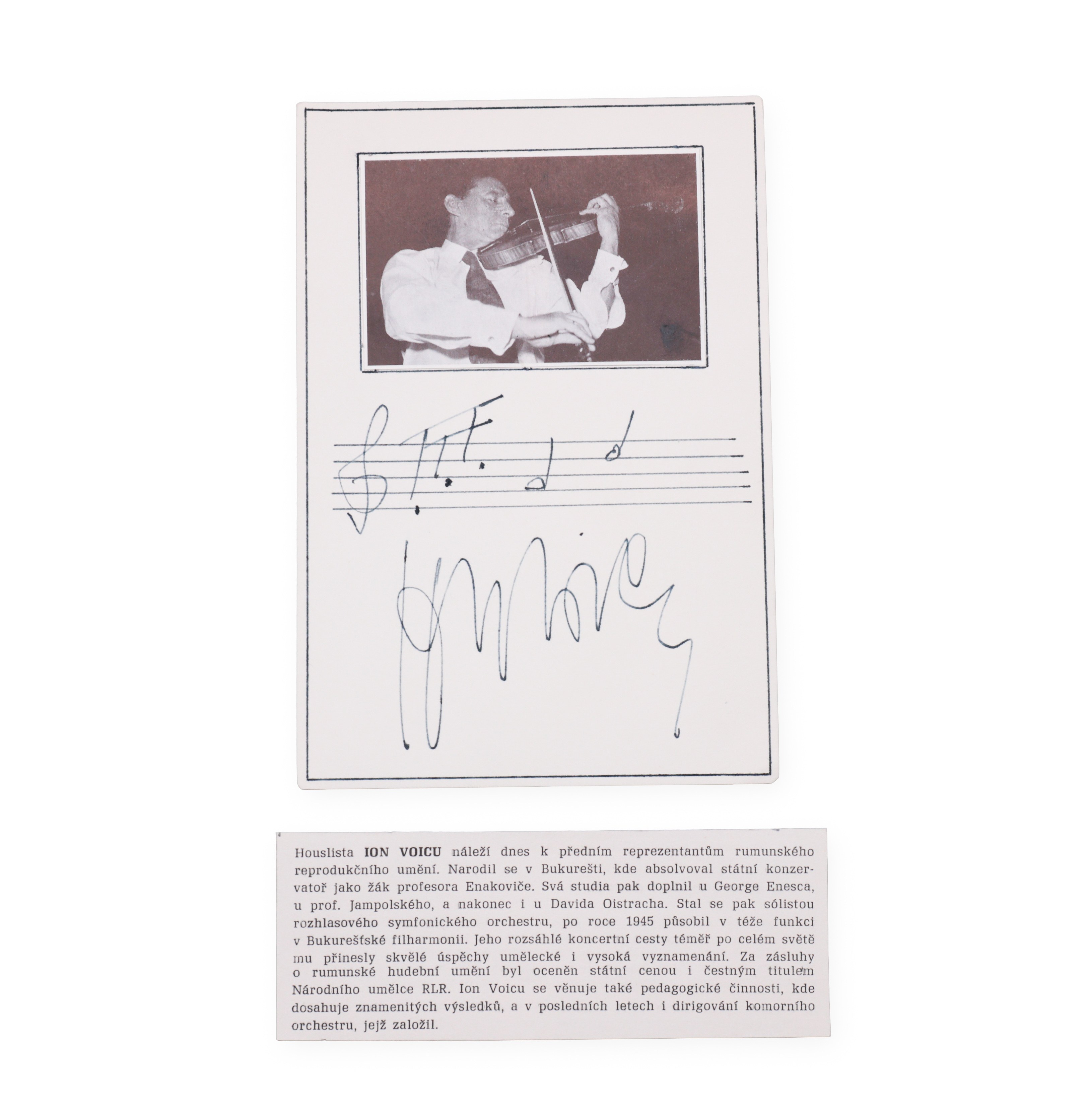 Signature of the Romanian violinist Ion Voicu with a short musical notation and a portrait photograph, accompanied by a separate informative text. One of the most important Romanian virtuosos of the 20th century, Voicu was renowned for his technical brilliance, singing tone and exceptional musical intelligence. He was the concertmaster of the Bucharest Philharmonic for many years and founded the famous George Enescu Chamber Orchestra in 1972, with which he achieved international recognition.