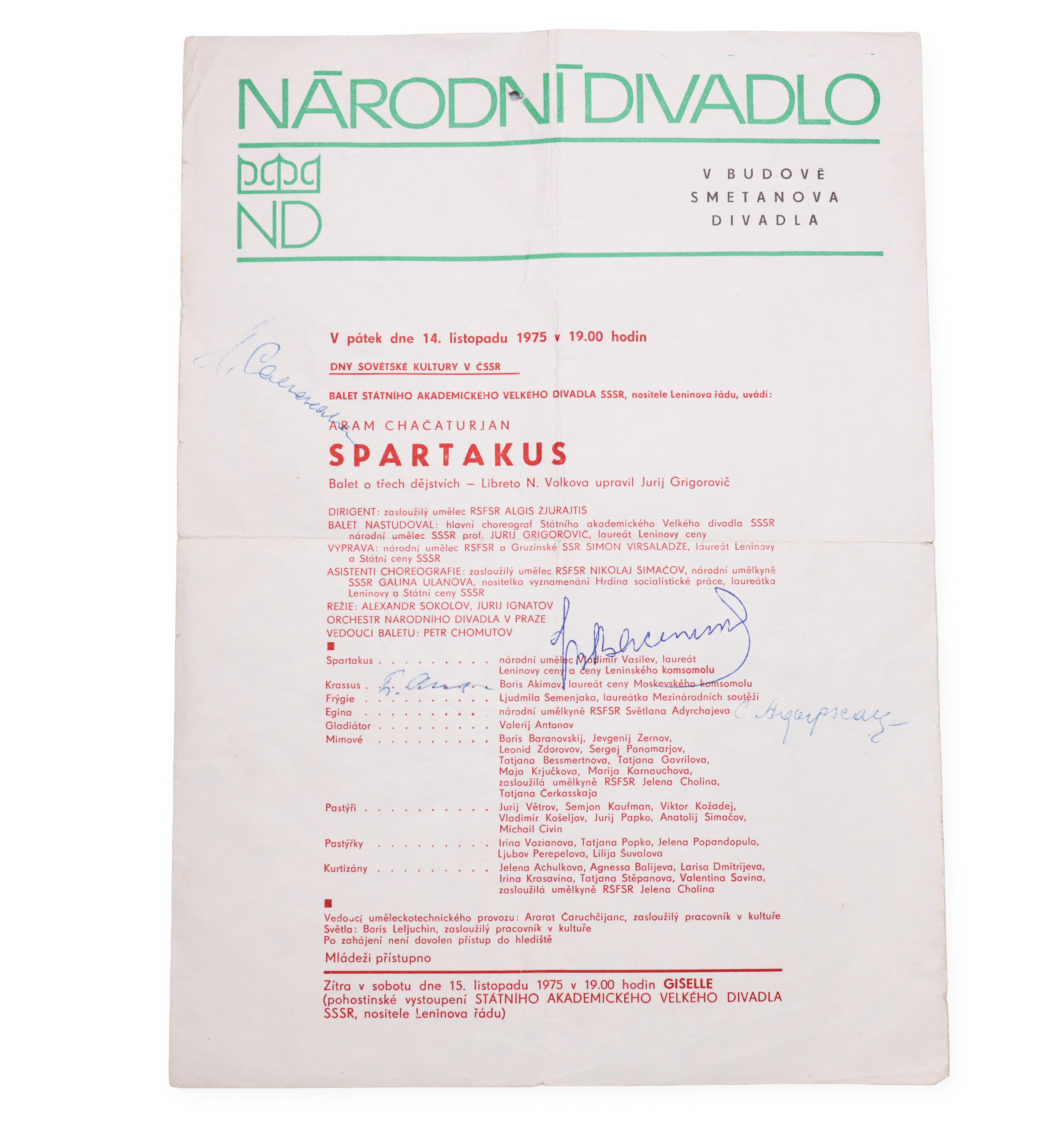 Vladimir Viktorovich Vasiliev - Russian ballet dancer and choreographer, considered one of the greatest personalities of world ballet. Signature on the program for the play "Spartacus" from 14/11/1975 together with the signatures of other performers, an authentic document connected with his artistic career.