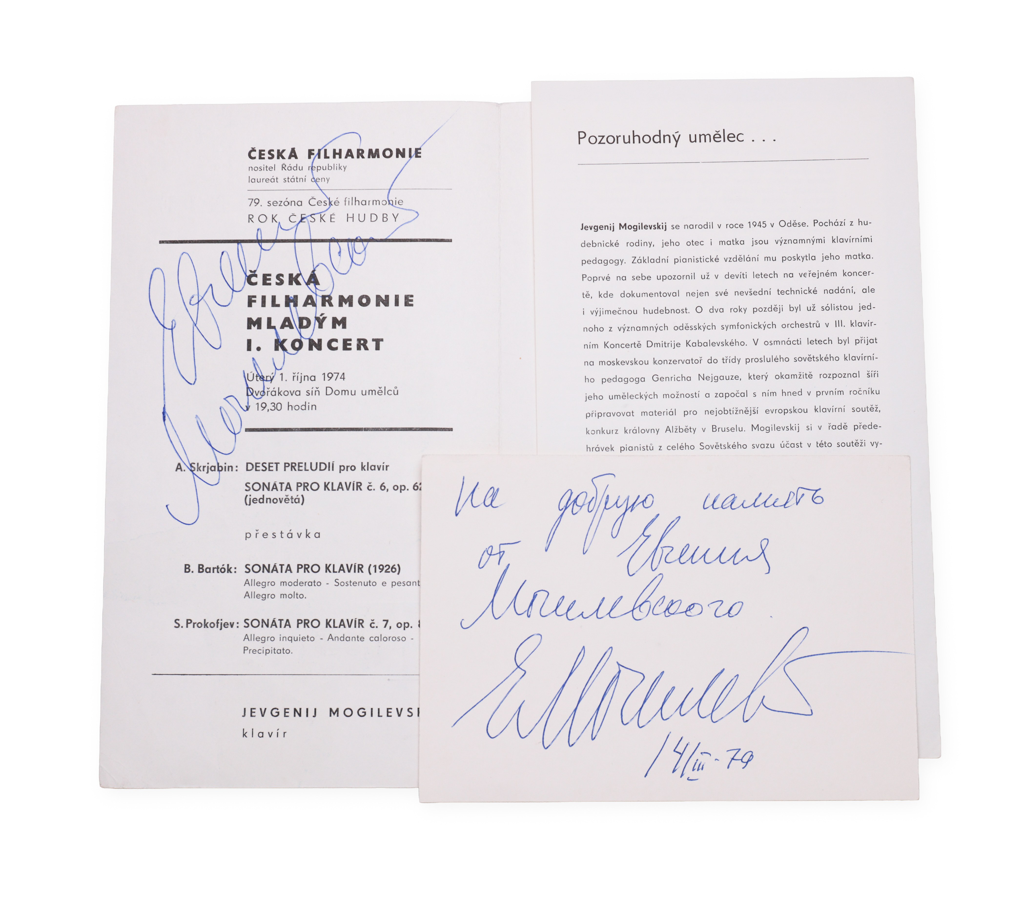 Signatures of piano virtuoso Evgeny Gedeonovič Mogilevsky – the first on the program for the Czech Philharmonic concert from October 1, 1974, the second on the cut dated March 14, 1979. Winner of the prestigious Queen Elizabeth Competition in Brussels (1964), Mogilevsky became famous for his deep musicality, technical brilliance and passionate expression. His interpretations of Chopin, Scriabin and Rachmaninov left a strong mark on world stages.