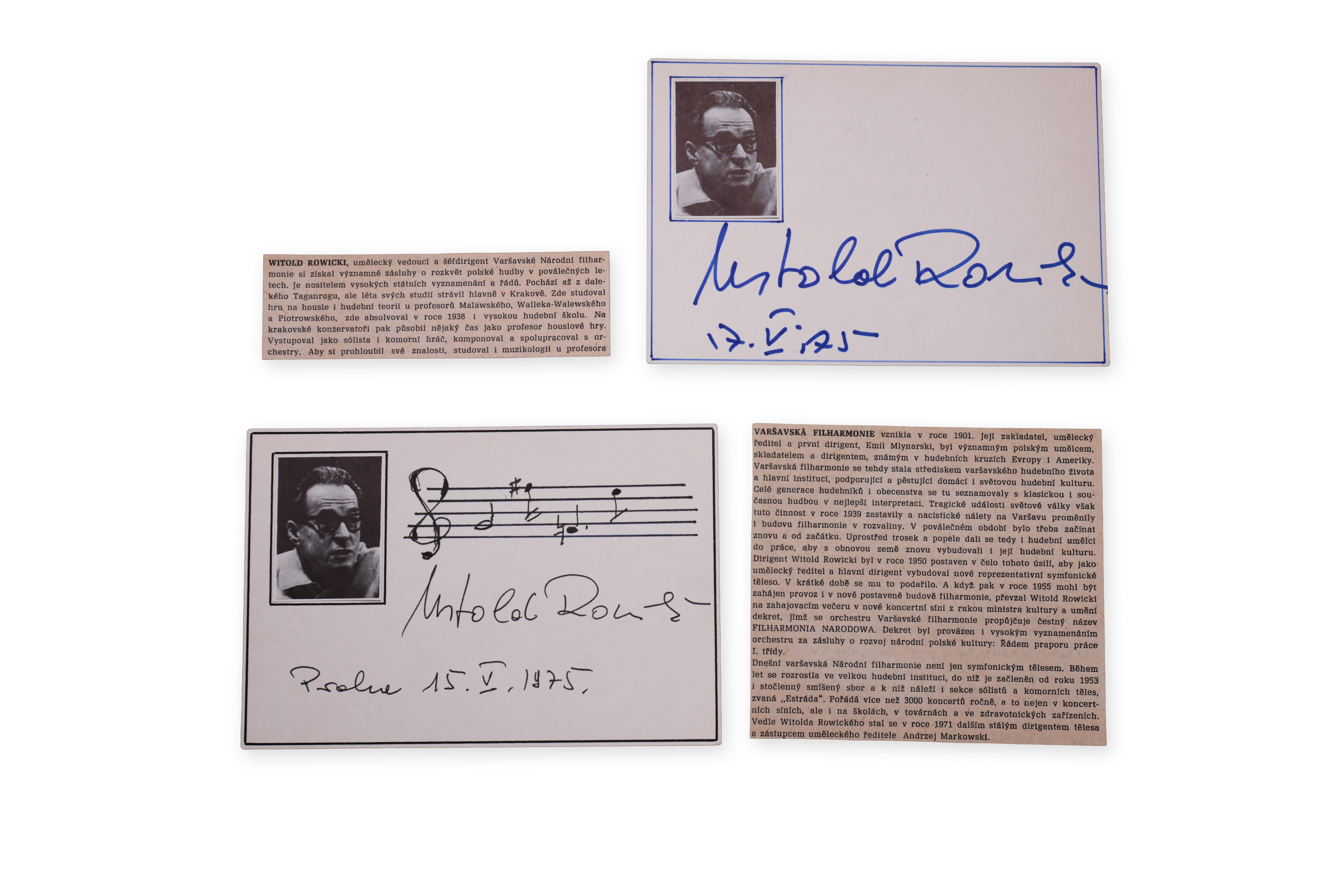 A pair of signature cards of the Polish conductor Witold Rowický, the first of which bears a musical notation, signature, photograph and date 15 May 1975, the second a signature with a portrait and date 17 May of the same year. Completed with two text fragments dedicated to the Warsaw Philharmonic, with which Rowicki was closely associated for many years. One of the most influential Polish conductors of the 20th century, known for his precision and promotion of Polish music abroad.