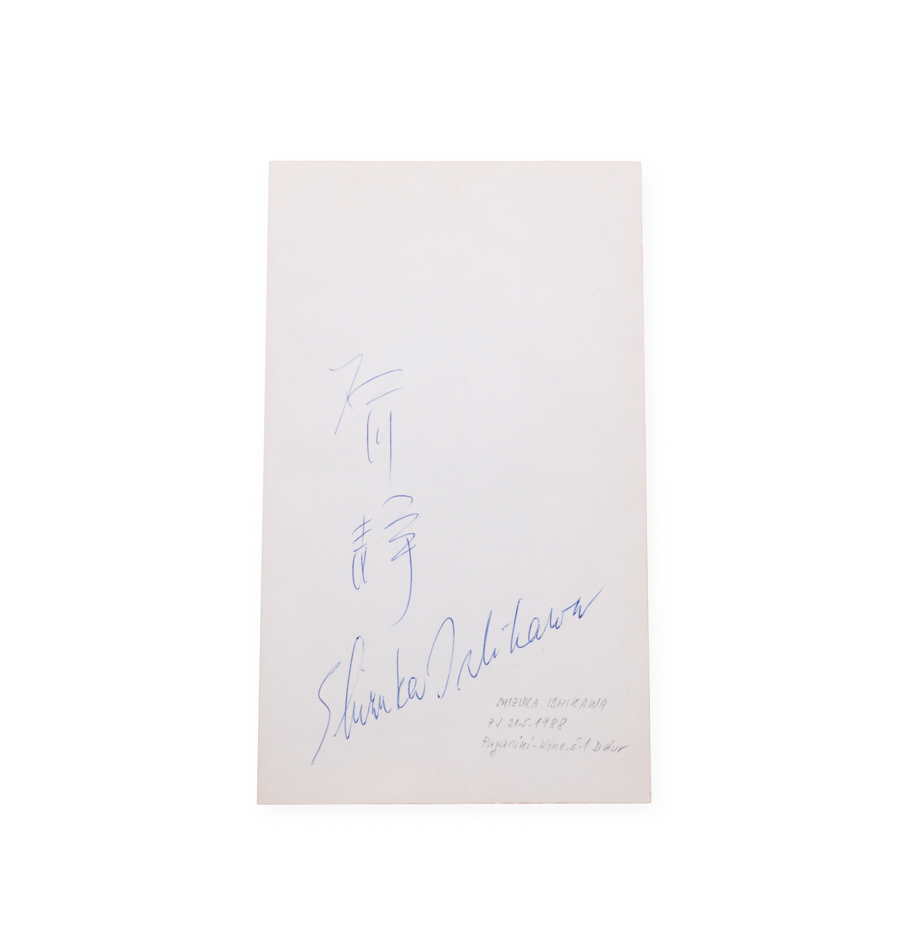 Shizuka Ishikawa - Japanese violinist with an international concert career. Signature on a ticket from the 1988 memorial, an authentic document associated with her musical activities.___________________________________________________________________________
