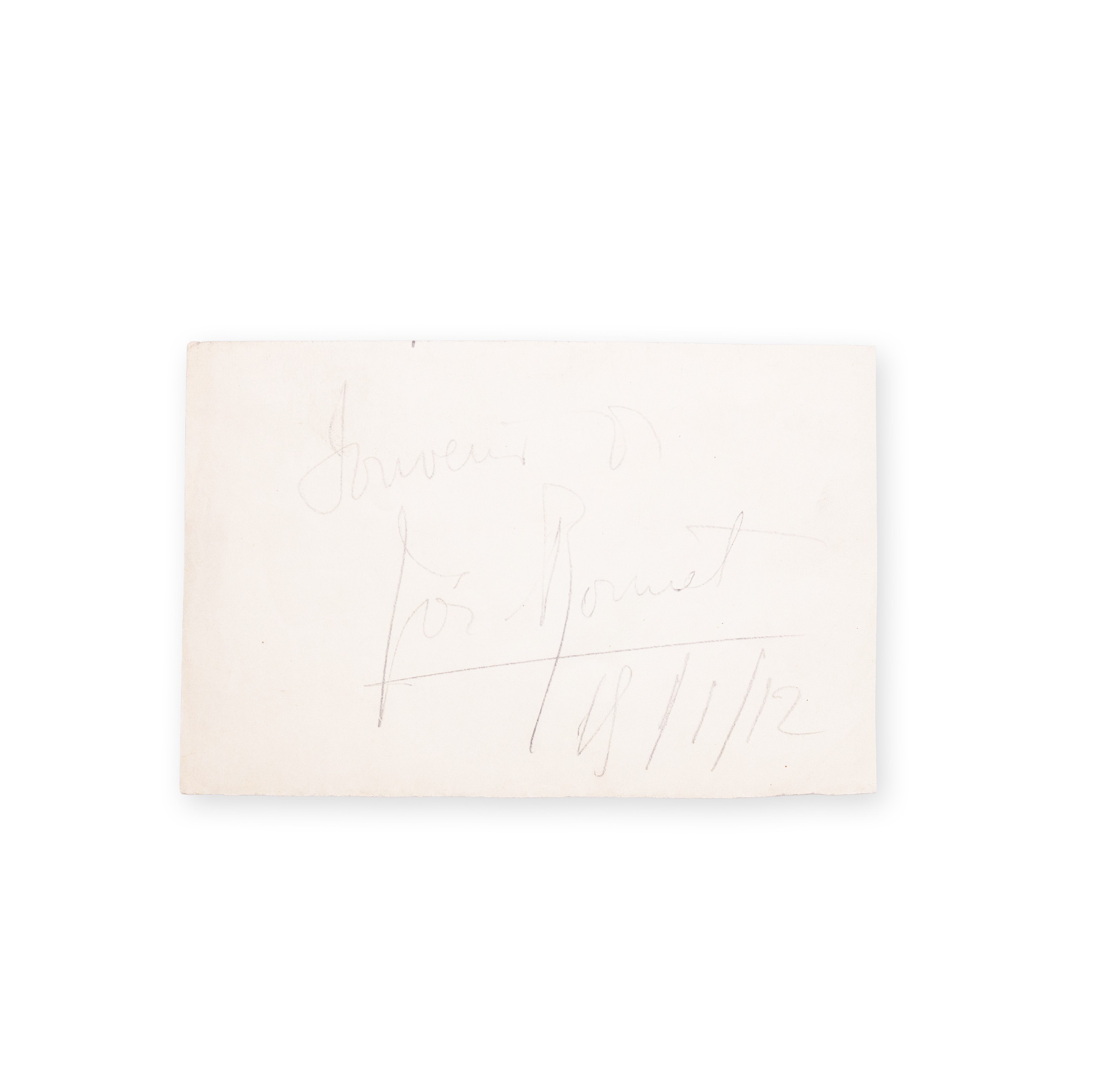 Signature of organist and composer Joseph Bonnet from 1912, complete with his handwritten word *"souvenir"*, on a small scrap of paper. Joseph Bonnet, one of the most important French organists of the first half of the 20th century, was famous for his concert tours and teaching activities and belonged to the successors of the great French organ tradition.___________________________________________________________________________