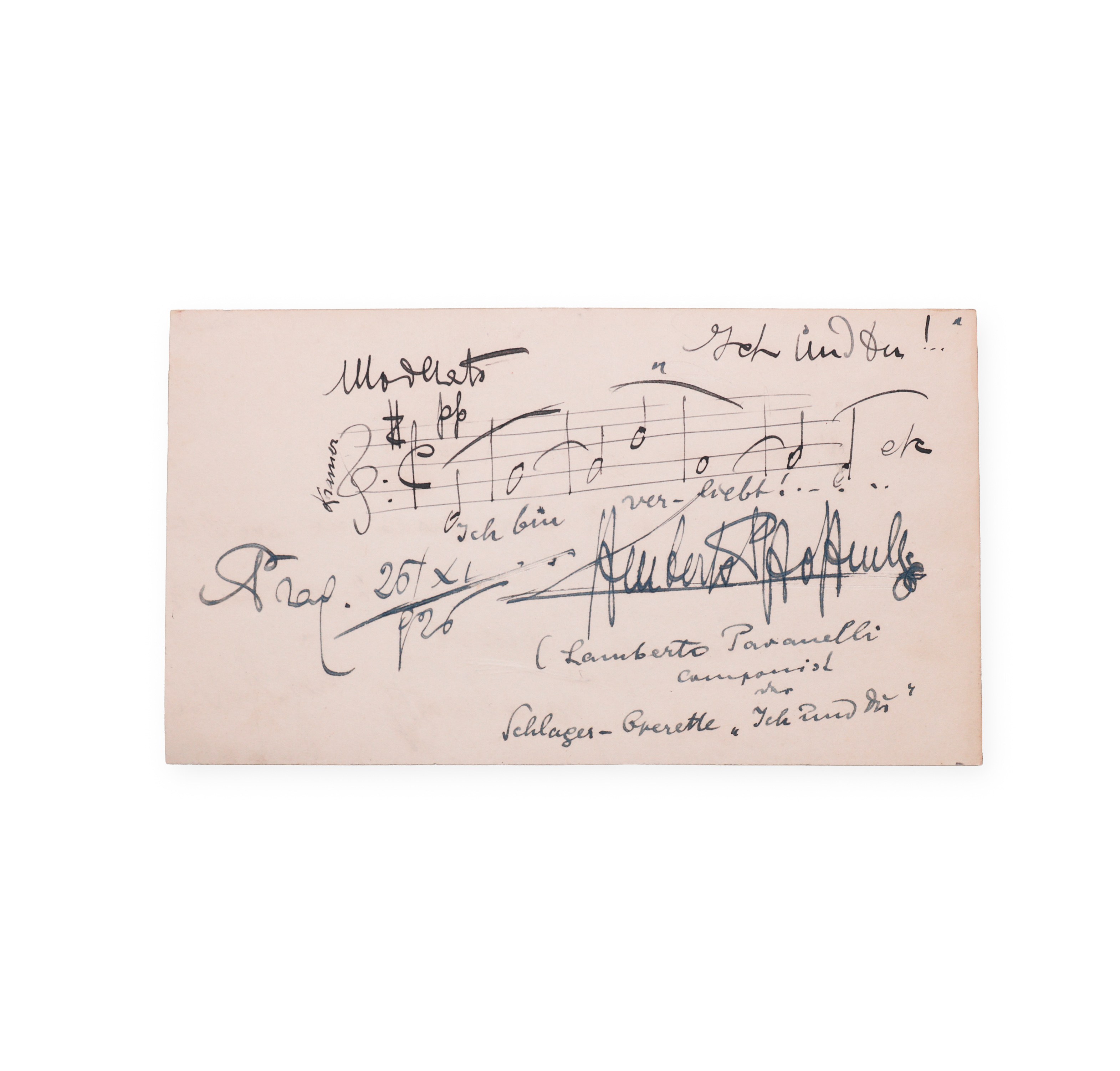 Handwriting with full name signature and musical notation on a scrap of paper, dated 11/25/1926. Lamberto Pavanelli was an Italian opera singer and pedagogue active mainly in the 1920s. He specialized in the Italian bel canto repertoire and performed on domestic and foreign stages.___________________________________________________________________________