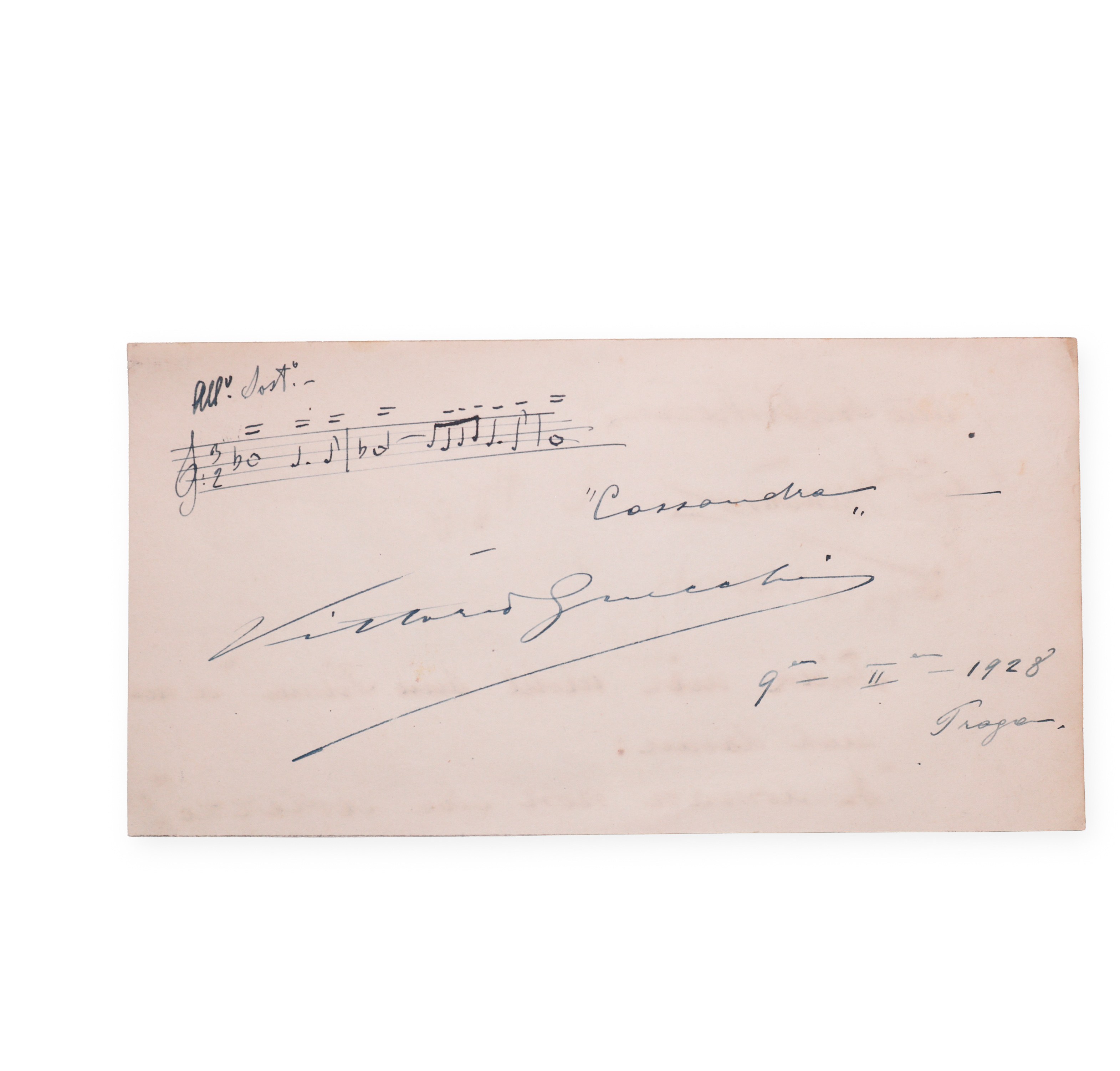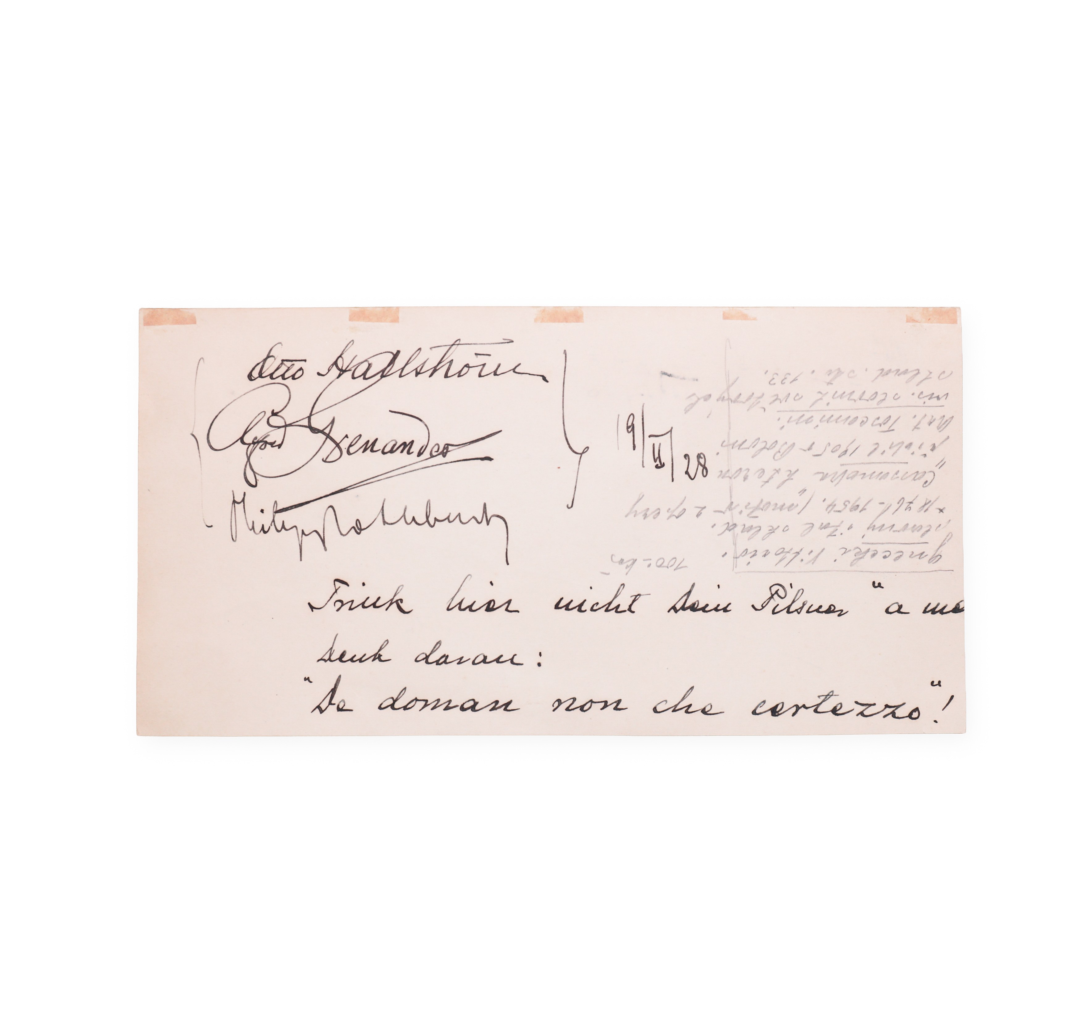 Handwritten dedication with the signature of Vittorio Godowski in his full name and notation on a scrap of paper, dated February 9, 1928. Vittorio Godowski, the son of the famous pianist Leopold Godowski, was also a musician and continued the family's artistic tradition.___________________________________________________________________________