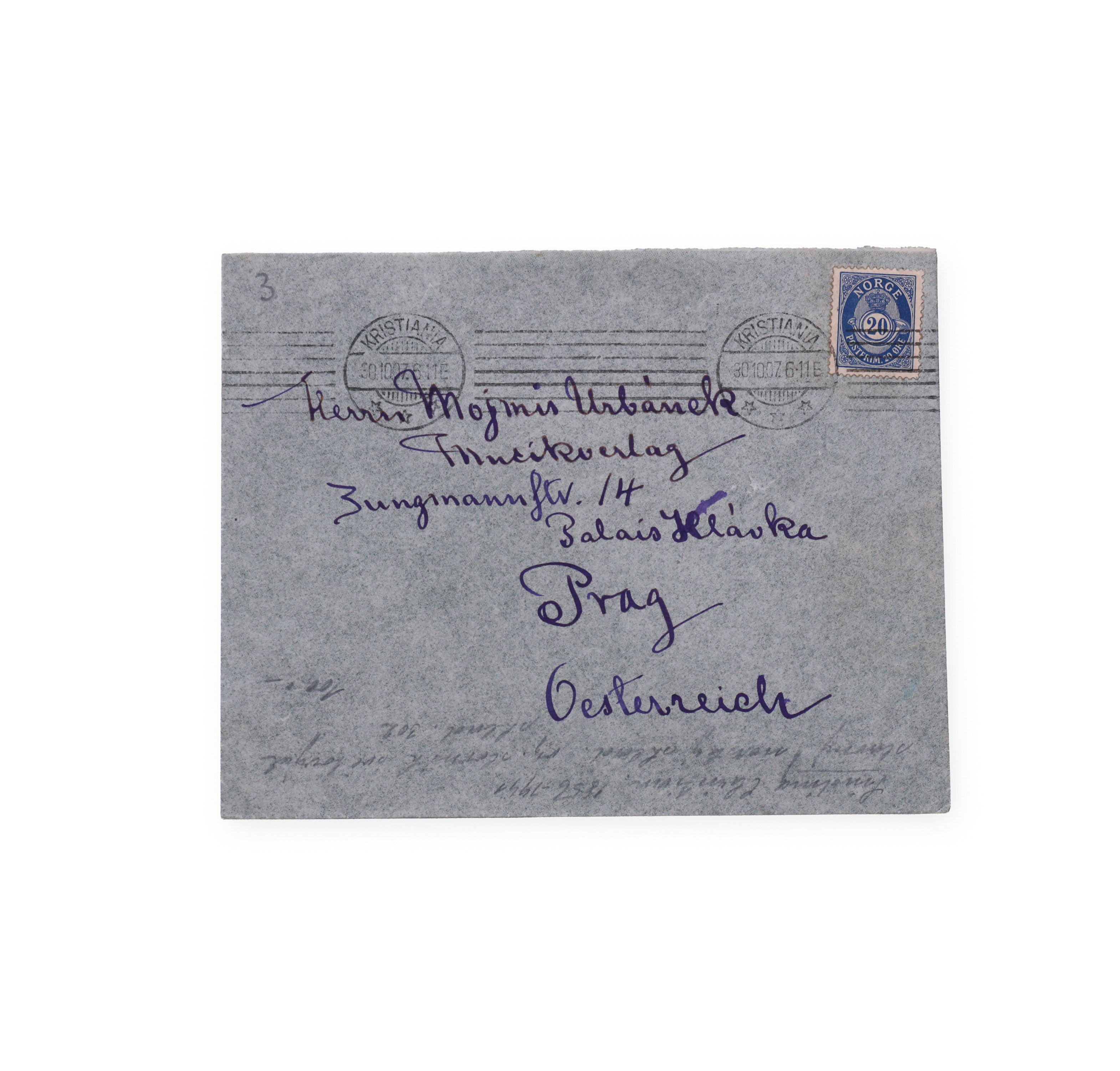 Signature with handwritten text by Christian Sinding on an envelope with a Norwegian postage stamp, sent from Christiania (today's Oslo) to Prague-Austria, dated 30 October 1907. Christian Sinding was an important Norwegian composer, known especially for romantic compositions for piano and orchestra, and considered one of the main representatives of Norwegian music after Edvard Grieg. The cover is an authentic document of his international correspondence and personal contact with the Czech environment.___________________________________________________________________________