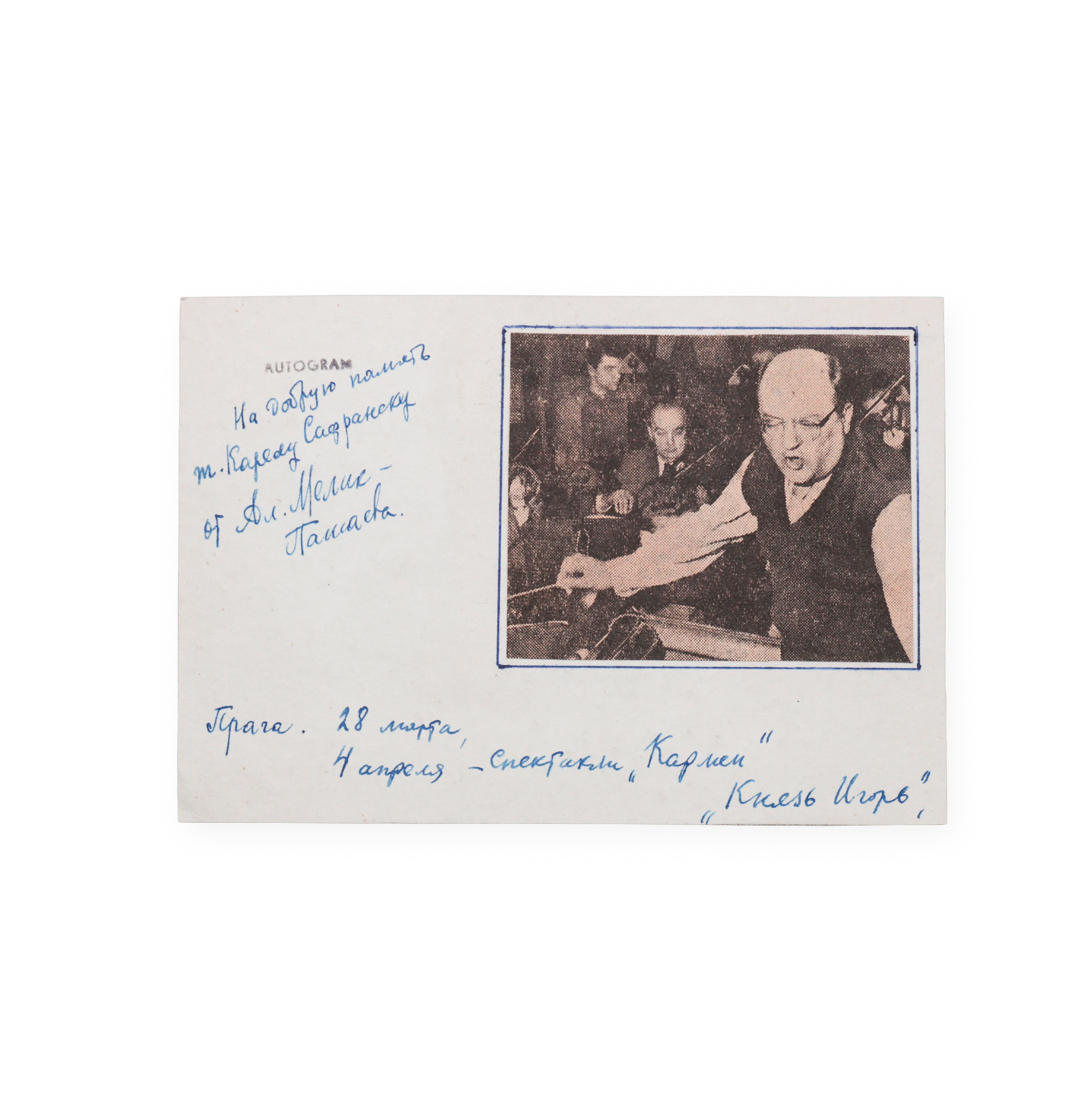 Signature with a handwritten dedication on an autograph card with a photo of the personality. Aleksandr Shamilevich Melik-Pashaev was a Soviet conductor, composer and teacher, longtime chief conductor of the Bolshoi Theater in Moscow. He became famous for his interpretations of the Russian opera repertoire and participated in important recordings and productions of the Soviet era.___________________________________________________________________________