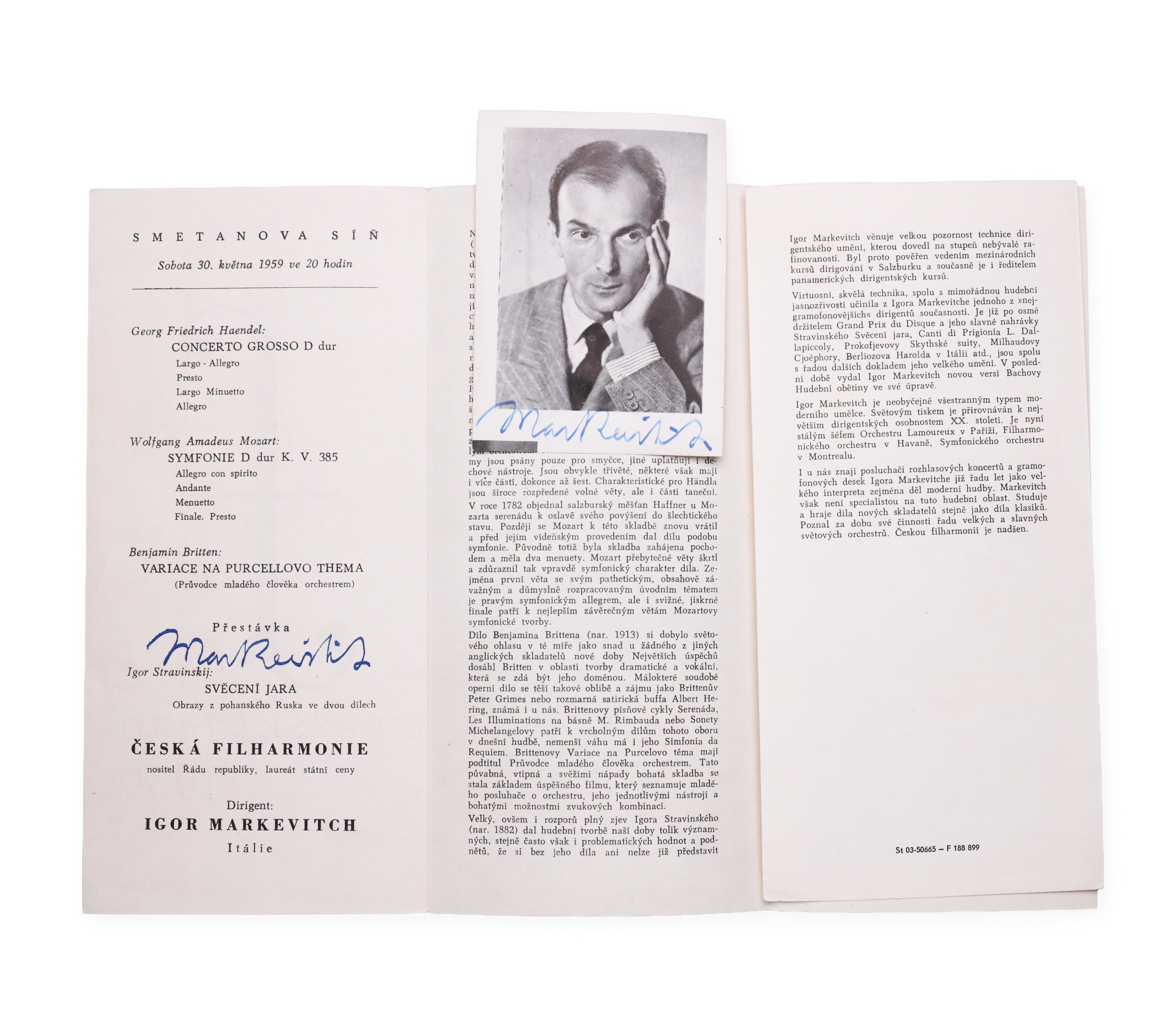 Original signature on the portrait reproduction and second signature on the music program, dated 1959. Igor Borisovich Markevitch was a Ukrainian-French conductor, composer and music teacher who worked with leading European orchestras. He became famous for his interpretations of modern music and collaborations with important composers of the 20th century, including Stravinsky and Bartók.___________________________________________________________________________