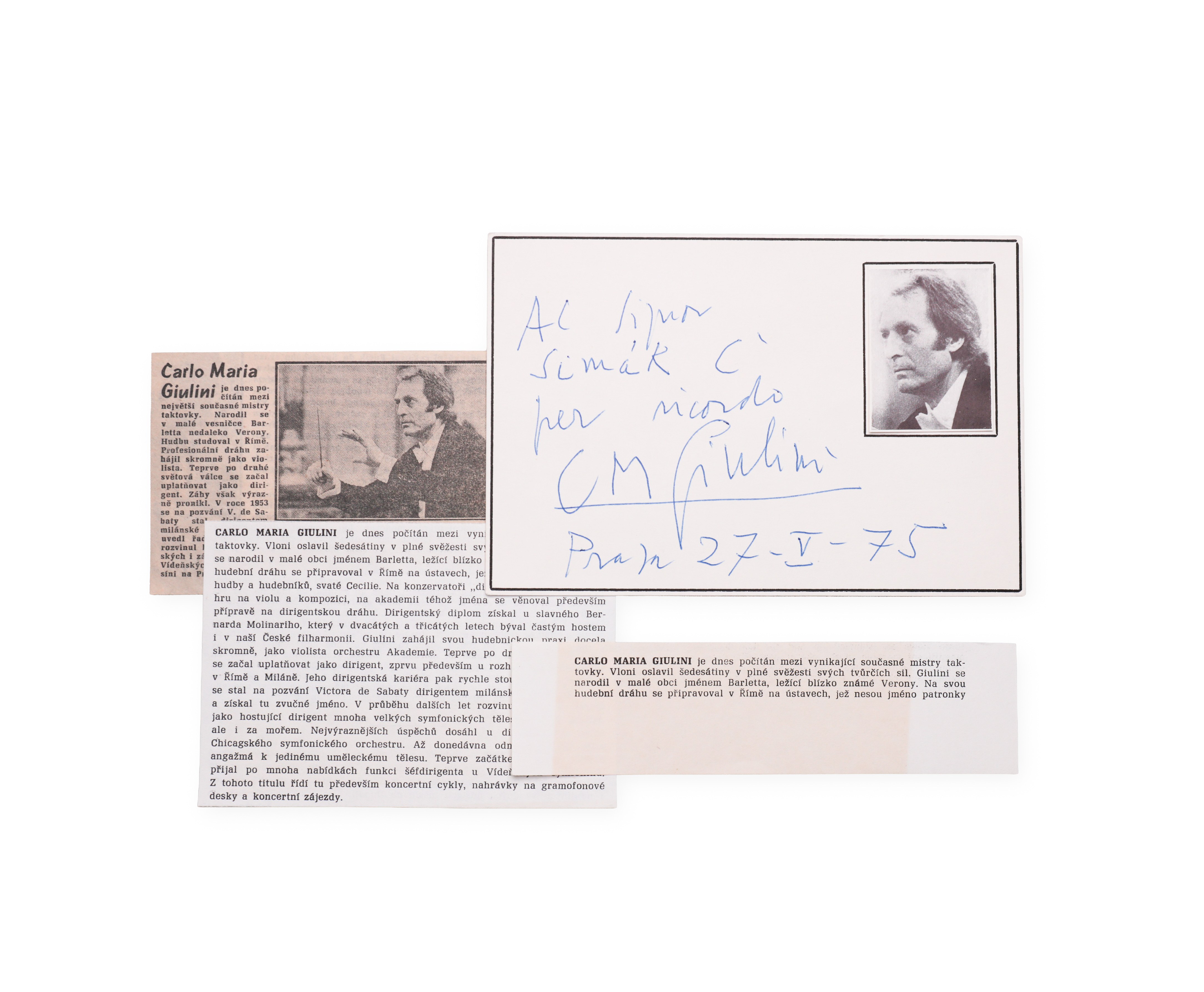 Carla Maria Giulin autograph card with handwritten dedication, signature and portrait photograph, dated 27 May 1975, accompanied by three informative newspaper clippings about his artistic activities. Carlo Maria Giulini was an Italian conductor renowned for his refined, deeply spiritual interpretations of orchestral and operatic works. He was one of the most recognized conductors of the 20th century and collaborated with the world's leading orchestras. This collection captures the personal and public reflection of his significant influence in international musical life.___________________________________________________________________________