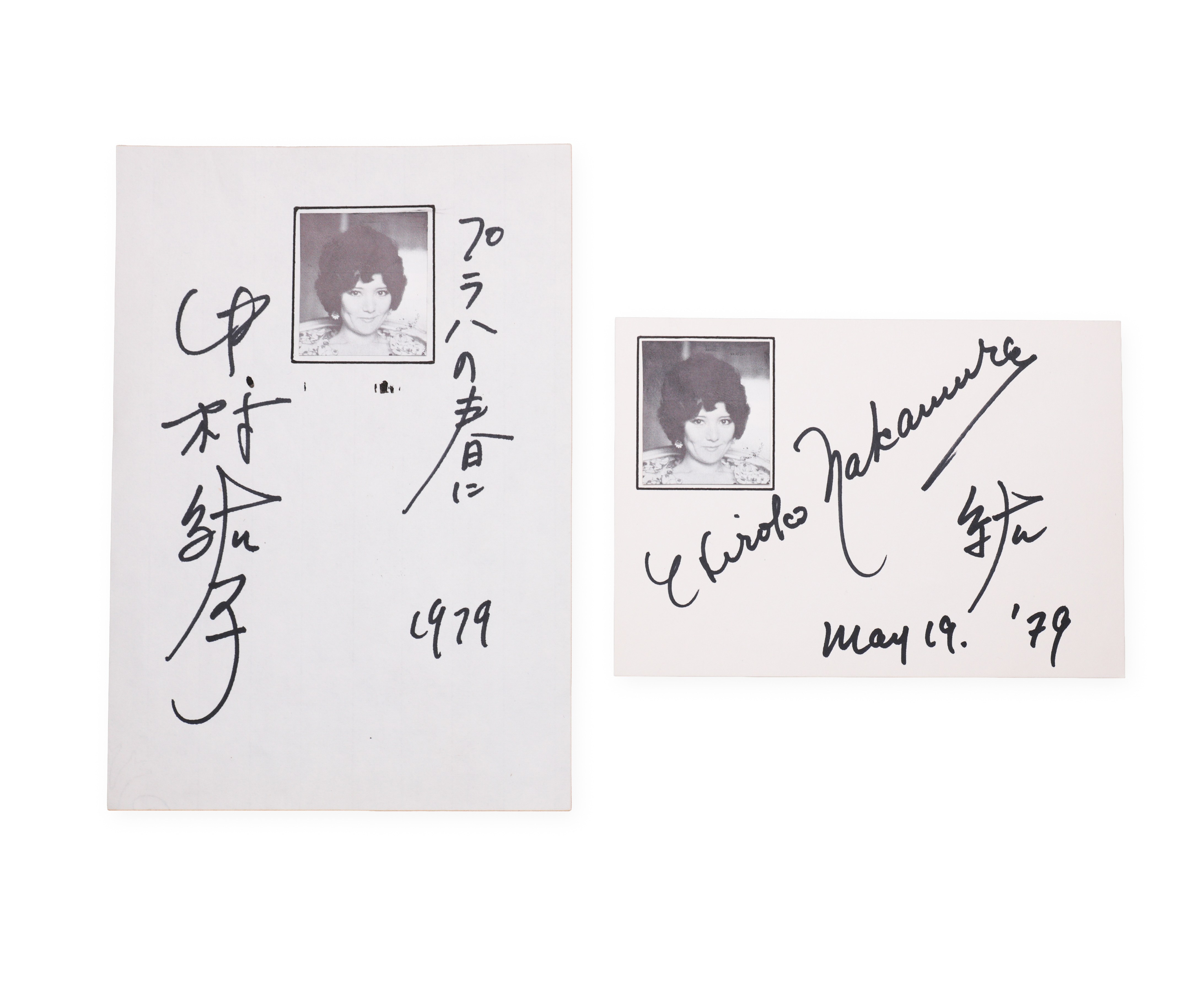 A set of two autograph cards with a photograph of the personality, one with a signature in kanji and a date, and the other with a signature in Latin and a date, both dated 19/05/1979. Hiroko Nakamura was a Japanese pianist, laureate of the International Chopin Competition, known for her virtuosity, deep feeling for romantic music and long-term work as a judge of prestigious piano competitions around the world.___________________________________________________________________________