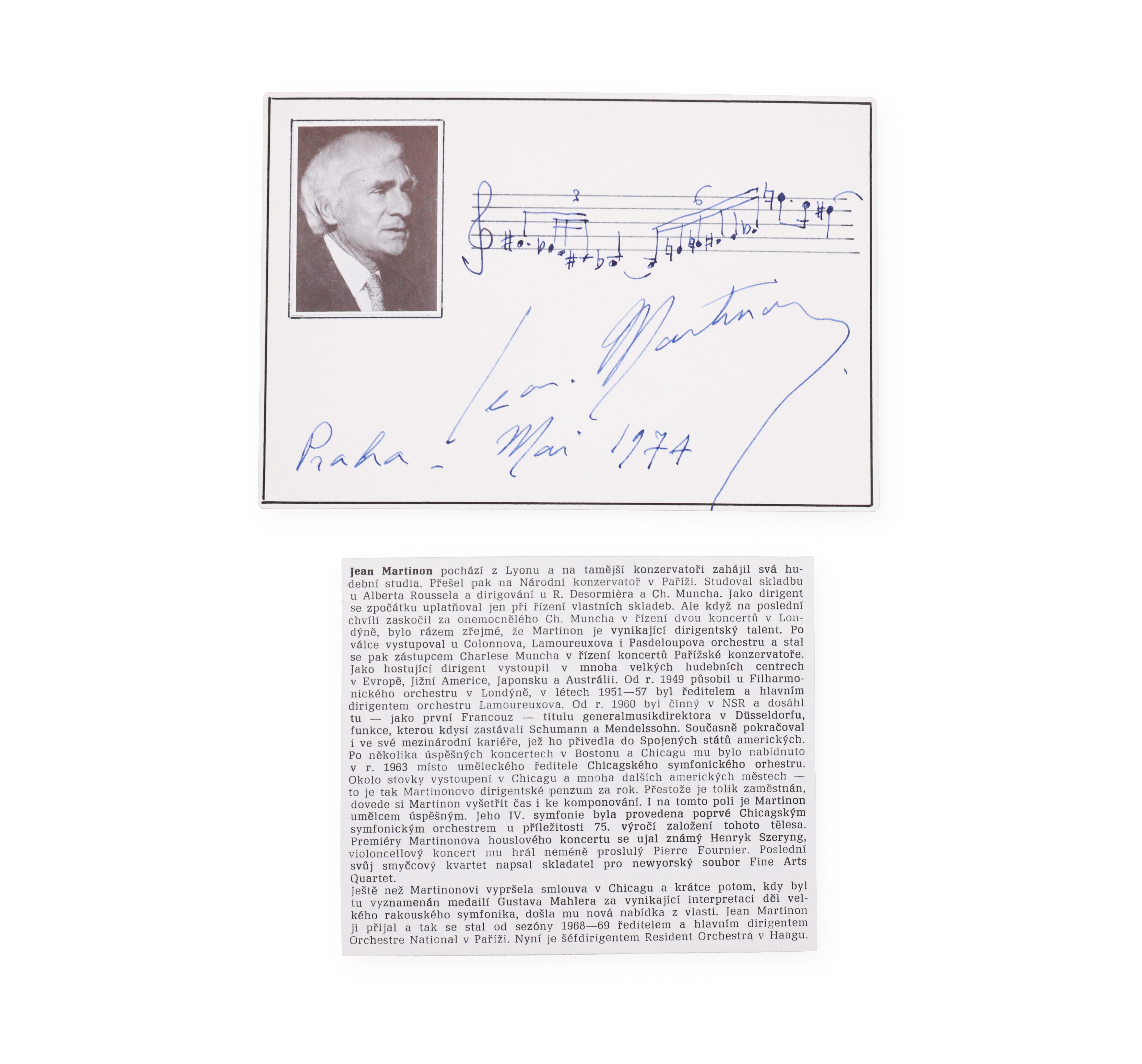 Autograph card with personality's signature and musical notation, with photo of personality and handwritten dating and location, accompanied by an informative newspaper clipping about the personality, dated 5/1/1974. Jean Martinon was a French conductor, composer and violinist who served as chief conductor of the Chicago Symphony Orchestra and other major European ensembles. He became famous for his interpretations of French music and his support of contemporary work.___________________________________________________________________________