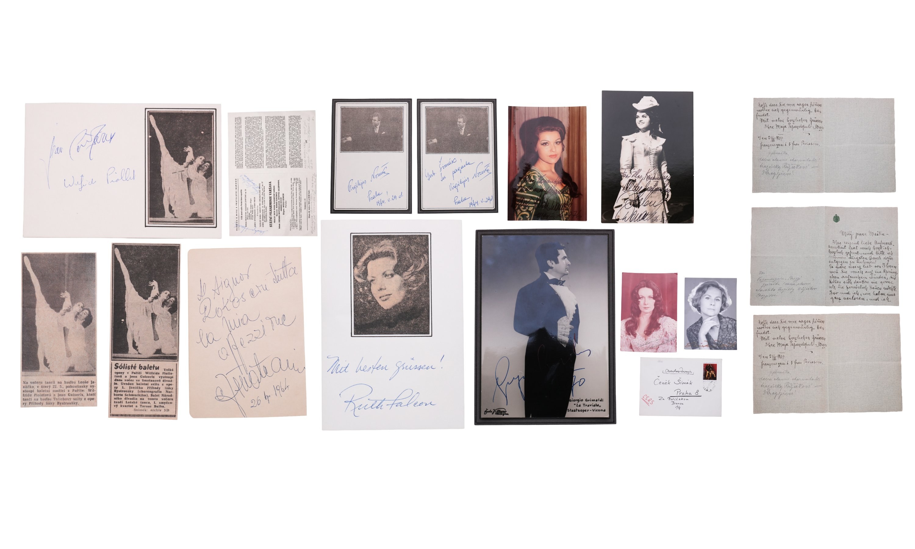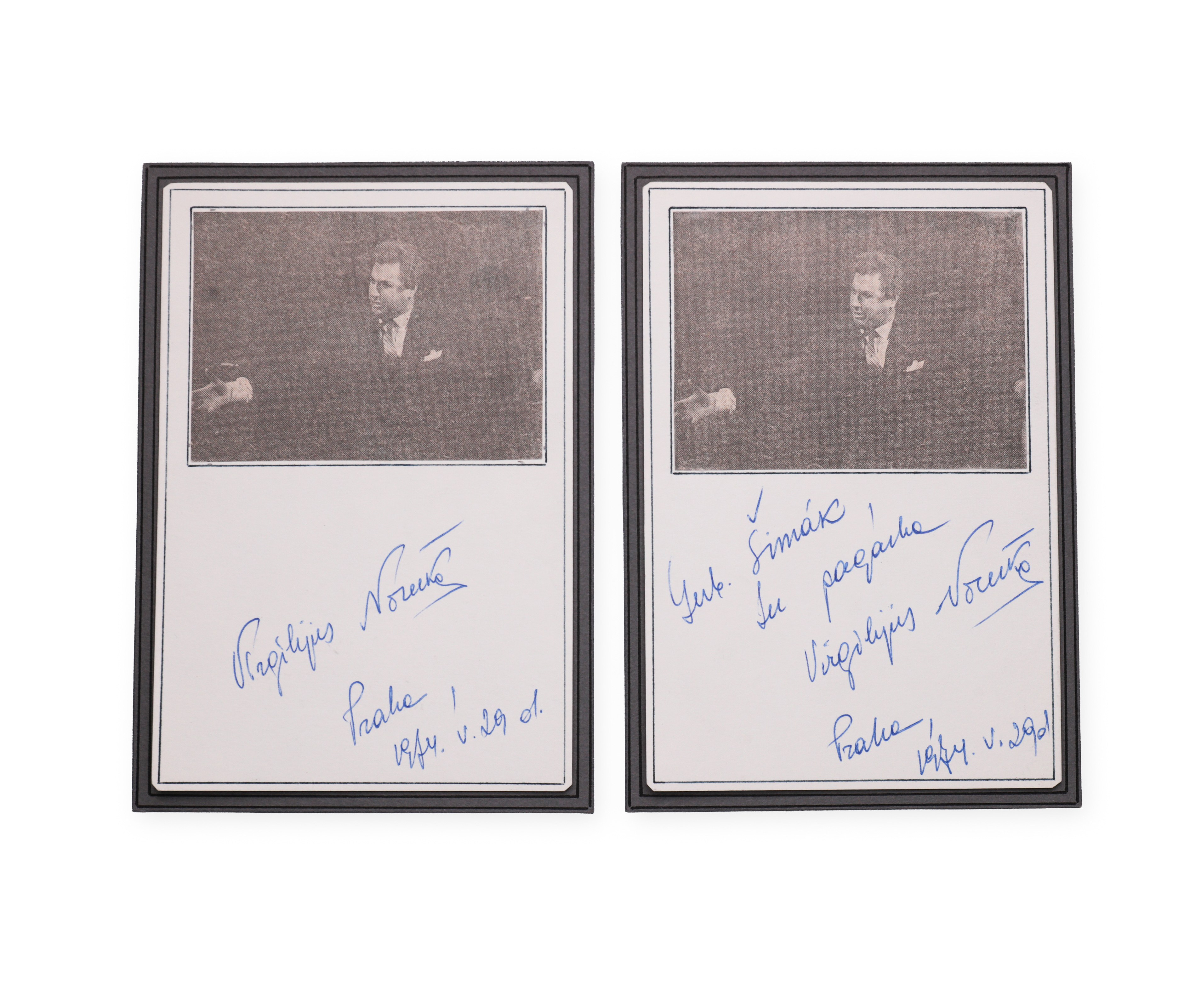 Two autograph cards of tenor Virgilijus Noreika, an important personality of the Lithuanian opera scene. The first card bears a handwritten dedication, a handwritten signature with the full name and the date "29.5.1974". The second contains the signature also with full name, date and location. Virgilijus Noreika was one of the most renowned tenors of Eastern Europe, renowned for his technical brilliance and interpretive refinement, thanks to which he performed on the leading opera stages of the world.___________________________________________________________________________